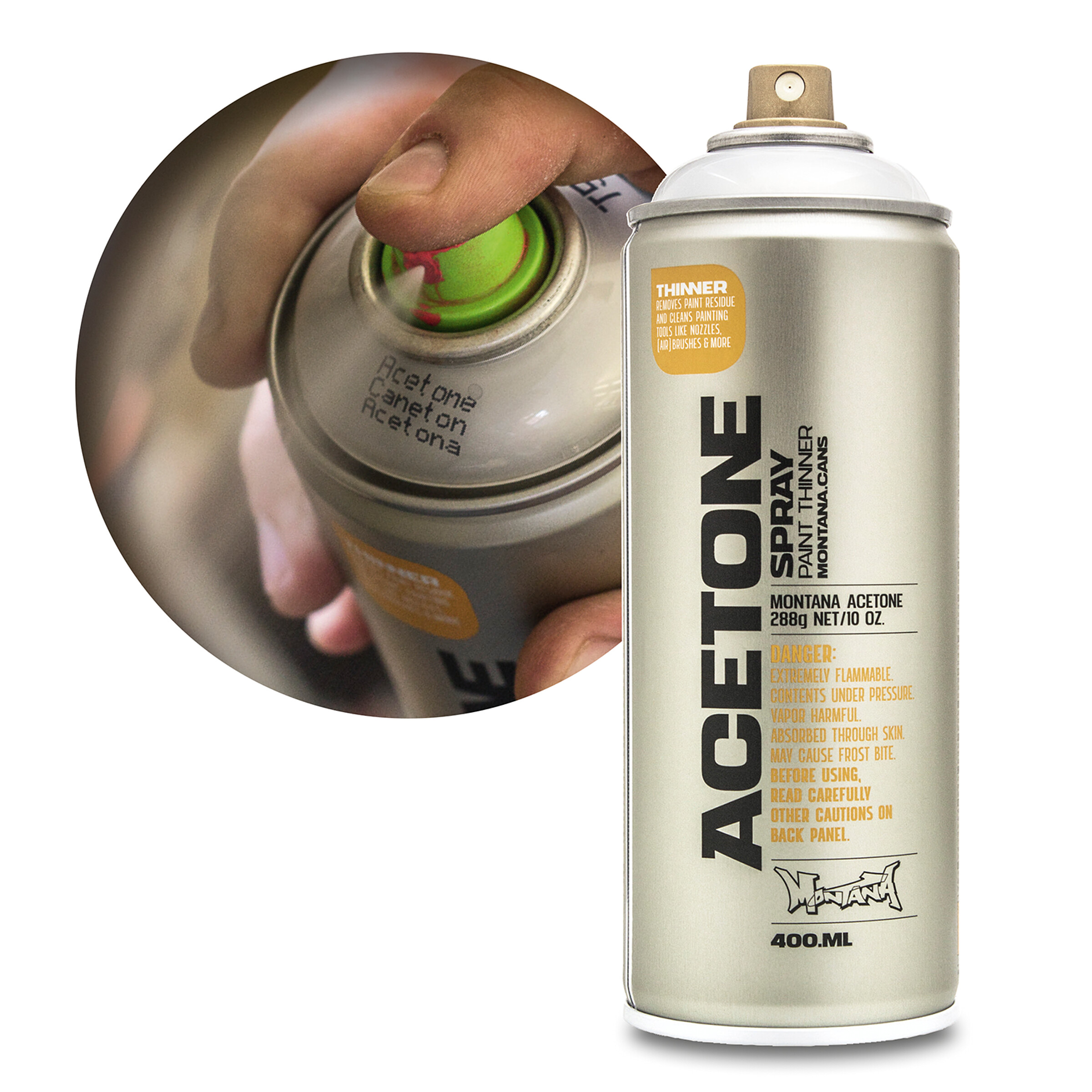 Das Montana Acetone Spray eignet sich zum Verdünnen von Lackfarben sowie zur Reinigung von Arbeitsmaterialien und Objekten. Verstopfte Sprühköpfe lassen sich im Handumdrehen von Farbrückständen befreien. Das farblose Spray entfernt Farb-, Lack-, Silikon-, Wachs- und Teerreste und ist gut für die Vorbehandlung von Malgründen geeignet. Es kann auf Porzellan, Glas, Keramik, Metallen und anderen Materialien verwendet werden. Das Spray eignet sich auch hervorragend zur Verklebung von Plexi- und Acrylglas. Montana Acetone Spray ist nicht ätzend und verdunstet schnell und rückstandsfrei. Hinweis: Testen Sie das Spray immer erst an einer möglichst wenig sichtbaren Stelle, um zu sehen wie es mit der Farbe oder dem Lack reagiert, besonders bei Untergründen aus Plastik. So können unerwünschte Resultate vermieden werden.