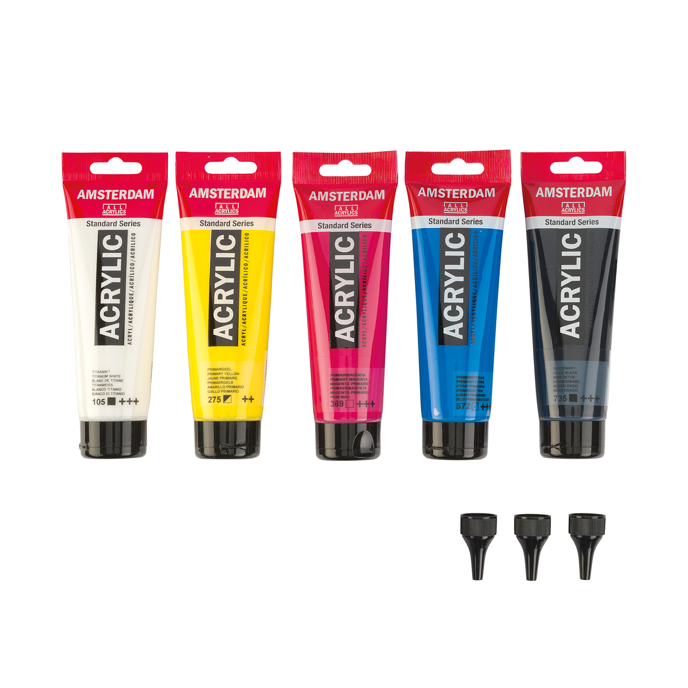 Das Set beinhaltet die Farben Titanweiß, Primärgelb, Primärmagenta, Primärcyan und Oxidschwarz sowie 3 Tuben-Dosieraufsätze.