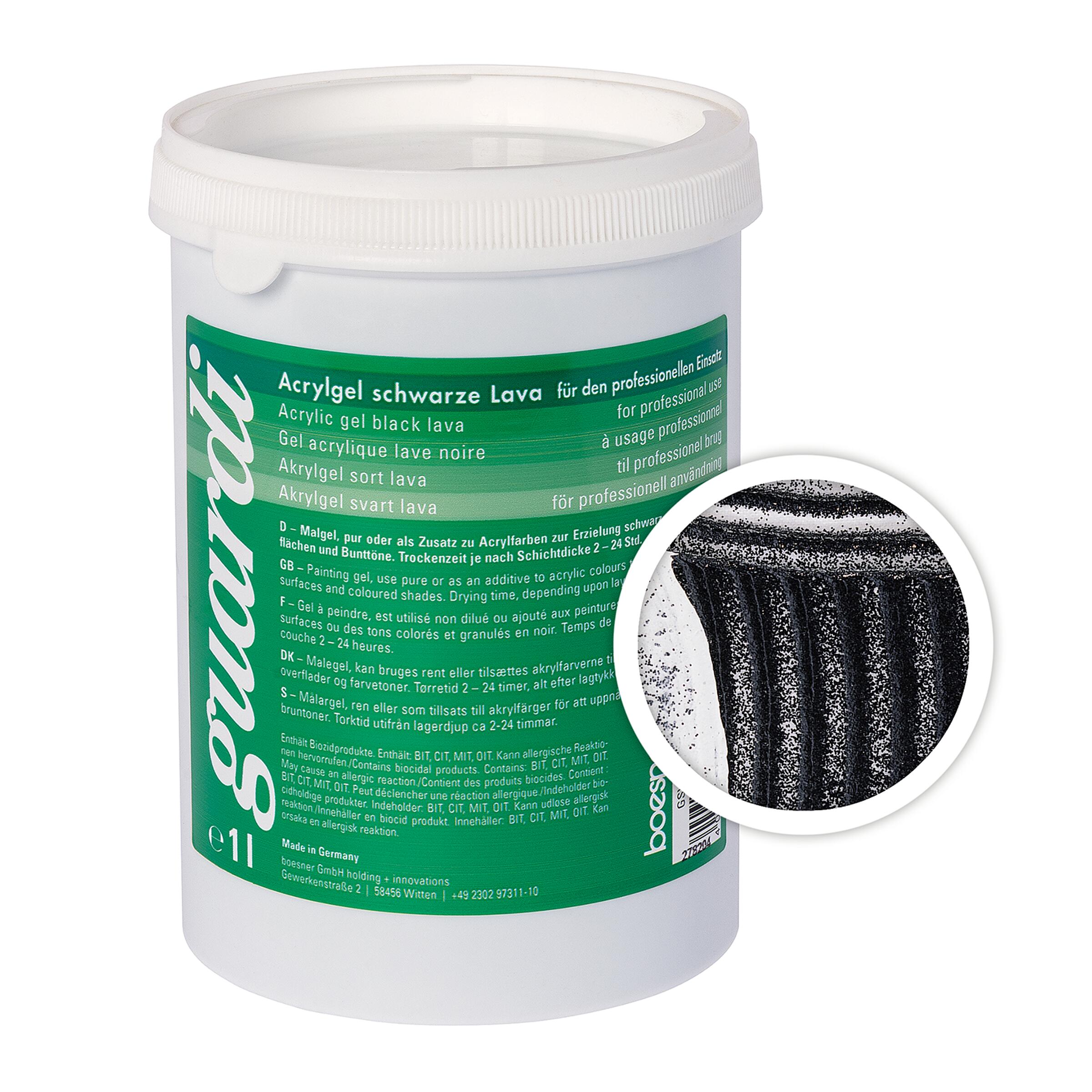 Milchig weißes Malgel mit schwarzer Oberflächenstruktur und Glitzereffekt. Das Bindemittel trocknet transparent auf. Als Zusatz zu Künstleracrylfarben zur Erzielung schwarz granulierter Bunttöne, ohne deren Koloristik zu verändern....