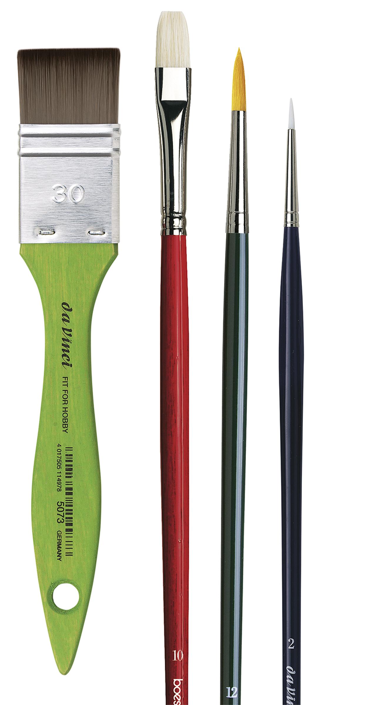 Enthalten sind ein breiter Universalpinsel Gr. 30 mit robustem Synthetikfaser-Besatz, Serie 5073, ein flacher Künstlerpinsel Gr. 10 mit ausgesuchten, mittellangen Naturborsten, Serie 7124, ein Impasto-Pinsel Gr. 2 mit kräftigem Nylonbesatz, Serie 7705 und ein Rundpinsel Gr. 12 mit auf Schluss präparierten, weißen Synthetikfasern und hoher Farbaufnahmekapazität, Serie 7784. Made in Germany.