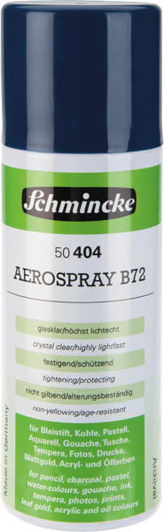 Dieses glasklare Fixativ eignet sich für Bleistift, Kohle, Pastell, Aquarell, Tusche, Tempera, Fotos, Drucke, Acryl- und Ölfarben. Es wirkt auf Basis des aus der Restaurierung bestens bekannten Paraloid® B72 Acrylharzes festigend und schützend und ist auch als Grund- und Schlussfirnis geeignet. Es ist höchst lichtecht, alterungsbeständig und nicht gilbend. Je nach Untergrund ergibt sich eine unsichtbare Fixierung (bei saugenden Untergründen) oder ein seidenmatter bis leicht glänzender Film (nichtsaugende Untergründe). AEROSPRAY B72 wird mehrfach – bei guter Belüftung – im Abstand von ca. 30 cm im Kreuzgang aufgesprüht.