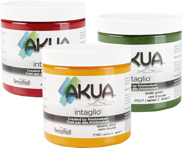 Druckfarbe auf Sojabasis für Tiefdruck, Hochdruck, Linol-/Holzschnitt und Monotypie. Die Farbe enthält hochwertige, lichtechte Pigmente, nur einen minimalen Anteil an Wasser und ist frei von Trocknungsbeschleuniger. Akua Intaglio Ink lässt sich leicht verarbeiten und schneller wischen. Darüber hinaus bildet die Druckfarbe keine Haut. Nach der Verarbeitung kann die Farbe problemlos mit Wasser und Seife entfernt werden. Drucke können unmittelbar nach dem Drucken wieder angefeuchtet werden. Nach dem Durchtrocknen ist die Druckfarbe permanent. Akua-Farben können sowohl auf angefeuchtetem als auch auf trockenem Papier gedruckt werden, je nach Technik und Motiv. Bei Linien und scharfen Kanten empfiehlt sich der Druck auf trockenem Papier.