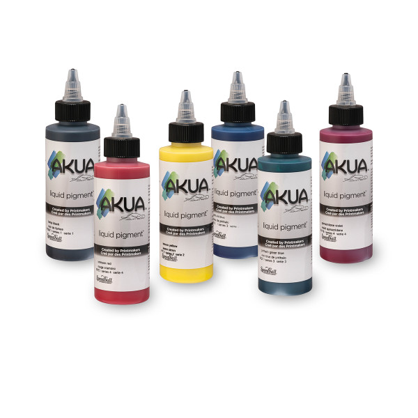 Die Monotypiefarbe auf Sojabasis enthält hochwertige, lichtechte Pigmente in hoher Konzentration. Sie ist außergewöhnlich farbintensiv, aber dennoch transparent und eignet sich ideal zum Drucken mehrerer Ebenen. Akua Liquid Pigment hat eine niedrige Viskosität, enthält kein zusätzliches Bindemittel und kann leicht modifiziert werden, um den Glanz, die Dicke und die Transparenz einzustellen. Mit dem Zusatz entsprechender Bindemittel lässt sich die Farbe auch problemlos zu einer Aquarell-, Gouache-, Acryl- oder Ölfarbe mischen. Die langsam trocknende Formel ermöglicht eine längere Verarbeitungszeit. Alle Farben sind lichtecht, tragen das AP-Siegel und lassen sich mit Wasser und Seife entfernen.