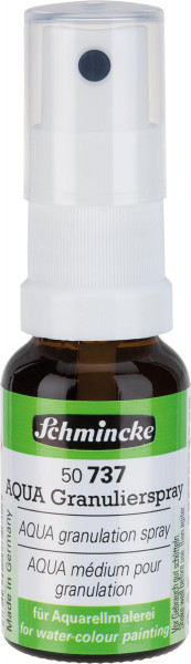 Das Aquarell-Pumpspray dient der Erzeugung von dem Granulieren ähnlichen Effekten bei normalerweise gleichmäßig verlaufenden Aquarellfarben. Es wird mit der feinen Zerstäuberdüse gezielt in die zu verändernde, feuchte Aquarellfarbe eingesprüht und sorgt dafür, dass sich die Pigmente im behandelten Bereich punktuell zusammenschließen. Bei granulierenden Farbtönen wird der Effekt verstärkt. Durch den Zerstäuberaufsatz können auch kleinste Bereiche innerhalb eines Bildes bearbeitet werden. Erhältlich im 15 ml-Zerstäuber.