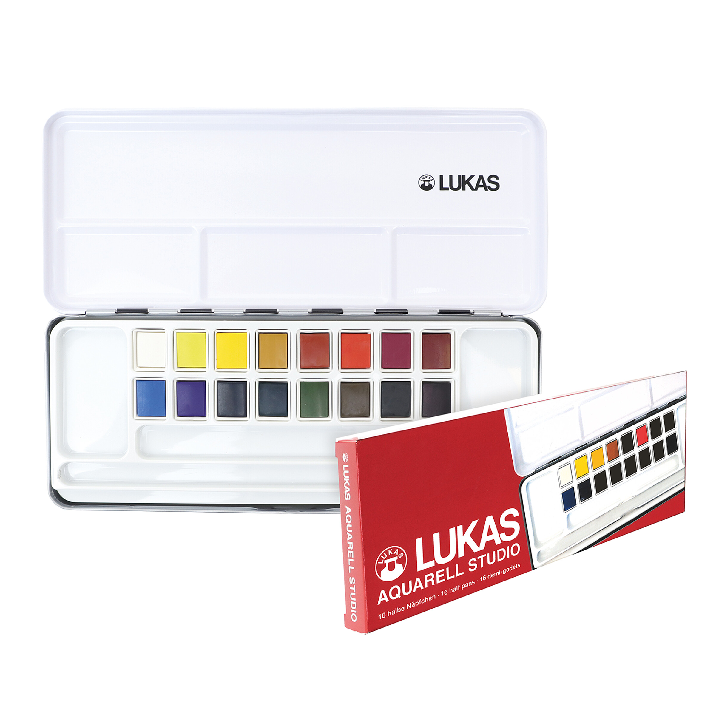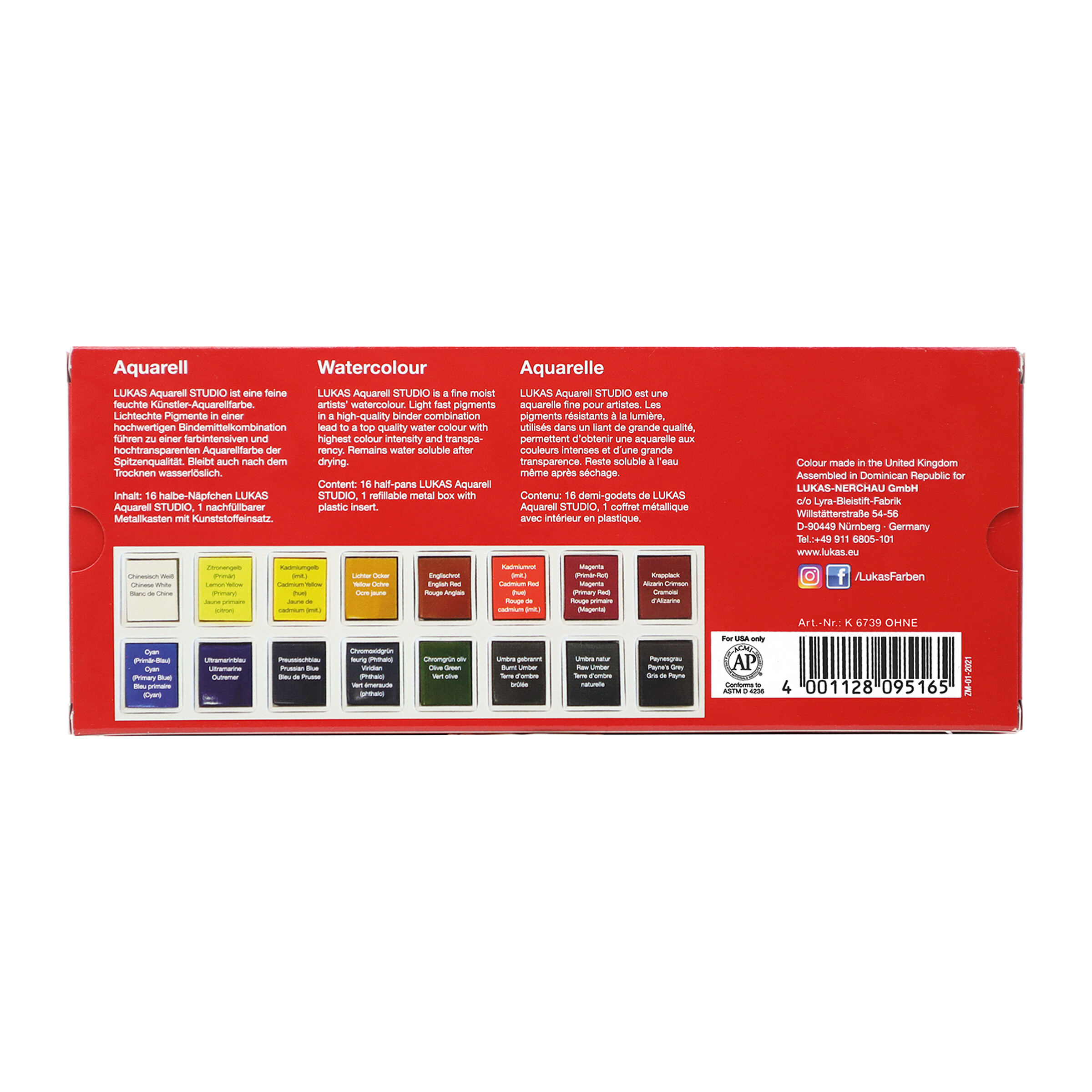 Die feinen, feuchten Künstler-Aquarellfarben von Aquarell Studio enthalten ausschließlich reine, hochwertige Künstlerpigmente in hoher Konzentration und weisen daher hohe Lichtechtheit, Farbintensität, Brillanz und Transparenz auf. Zudem lassen sie sich leicht anlösen und besitzen eine ausgezeichnete Vermal- und Verwaschbarkeit durch die Bindemittel-Verbindung aus reinem Gummiarabicum, ausgewählten Dextrinen und Glukose-Derivaten. Mithilfe des ausgewogenen Spektrums von 16 Farbtönen können zahlreiche weitere, brillante Farbnuancen und feinste Verwaschungen erzielt werden. Der Metallkasten mit Kunststoffeinsatz beinhaltet 16 halbe (1/2) Näpfchen (N), und eine ausklappbare Mischpalatte. Kastengröße: 9 x 23 cm.