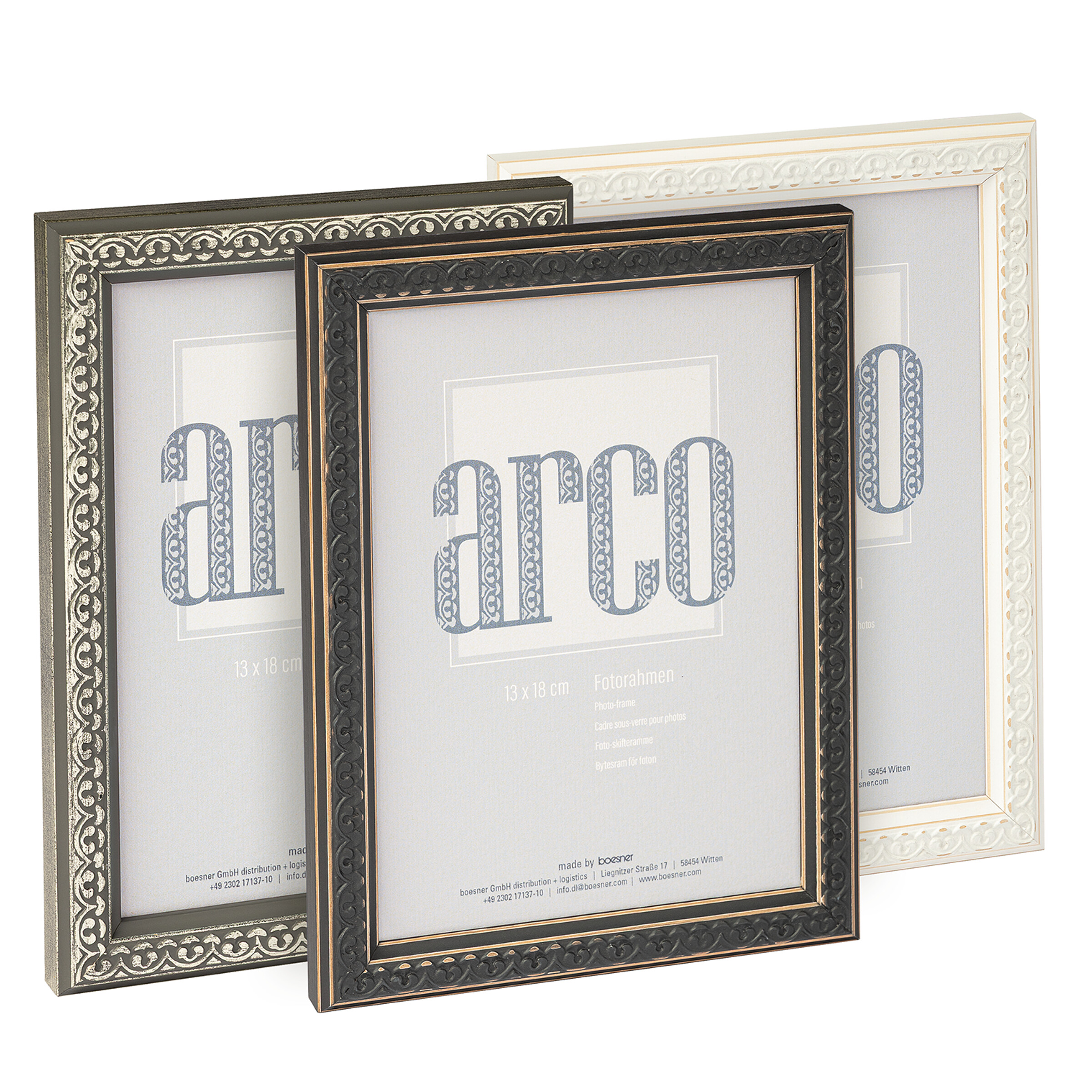 Der Massivholzrahmen mit schmalem Profil in Nostalgie-Optik ist mit filigranen Verzierungen versehen. Arco ist ideal geeignet für die Einrahmung von Fotos, Zeichnungen, Drucken etc. Der Rahmen wird aus heimischer Kiefer in europäsichen...