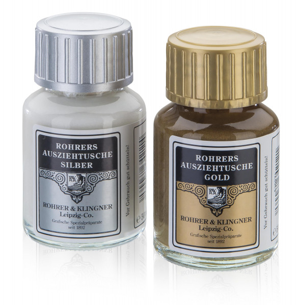 Flüssige Bronze-Farbe auf Wasserbasis für Dekorationszwecke und Kalligrafie. Aus optischen und technischen Gründen wird bei der Farbe Gold ein Bronzepigment (Kupferlegierung) eingesetzt. Die gebrauchsfertige, mit Wasser verdünnbare Tusche kann mit Pinsel, Feder, Ziehfeder und Airbrush (Düsen-Ø: 0,5 –0,8 mm) auf Papier, Karton und Holz verarbeitet werden. Stark saugende Untergründe sollten vor dem Auftragen mit einer in der Malerei gängigen Grundierung – z. B. einem Gesso auf Dispersionsbasis – grundiert werden. Andere Untergründe, wie Gewebe, Metall oder Glas sind vor dem Bemalen im Hinblick auf Haftfestigkeit und Benetzung zu testen. Die Tusche ist glänzend, ausgesprochen brillant und trocknet nach ausreichender Zeit für die Nachtrocknung wasserfest auf. Sie kann mit der Zeichentusche von Rohrer & Klingner eingefärbt werden. Dabei entstehen Metalliceffekte und – je nach Art des Auftrages – weitere interessante Farb-/Metallwirkungen.
