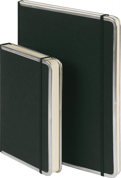 Der robuste, fadengebundene Klassiker mit silbernen Metallkanten und schwarzem Leinenrücken ist ein unverwüstlicher Begleiter für unterwegs. Das chamoisfarbene, säurefreie 90 g/m²-Papier mit rundgeschliffenen Ecken ist zwischen den soliden Deckeln aus Schwarzpappe bestens geschützt. Jedes Buch ist mit einer praktischen Einstecktasche im hinteren Deckel sowie einem schwarzen Gummi-Verschlussband ausgestattet. In blanko und liniert erhältlich. Handgefertigt in einer bayerischen Manufaktur.