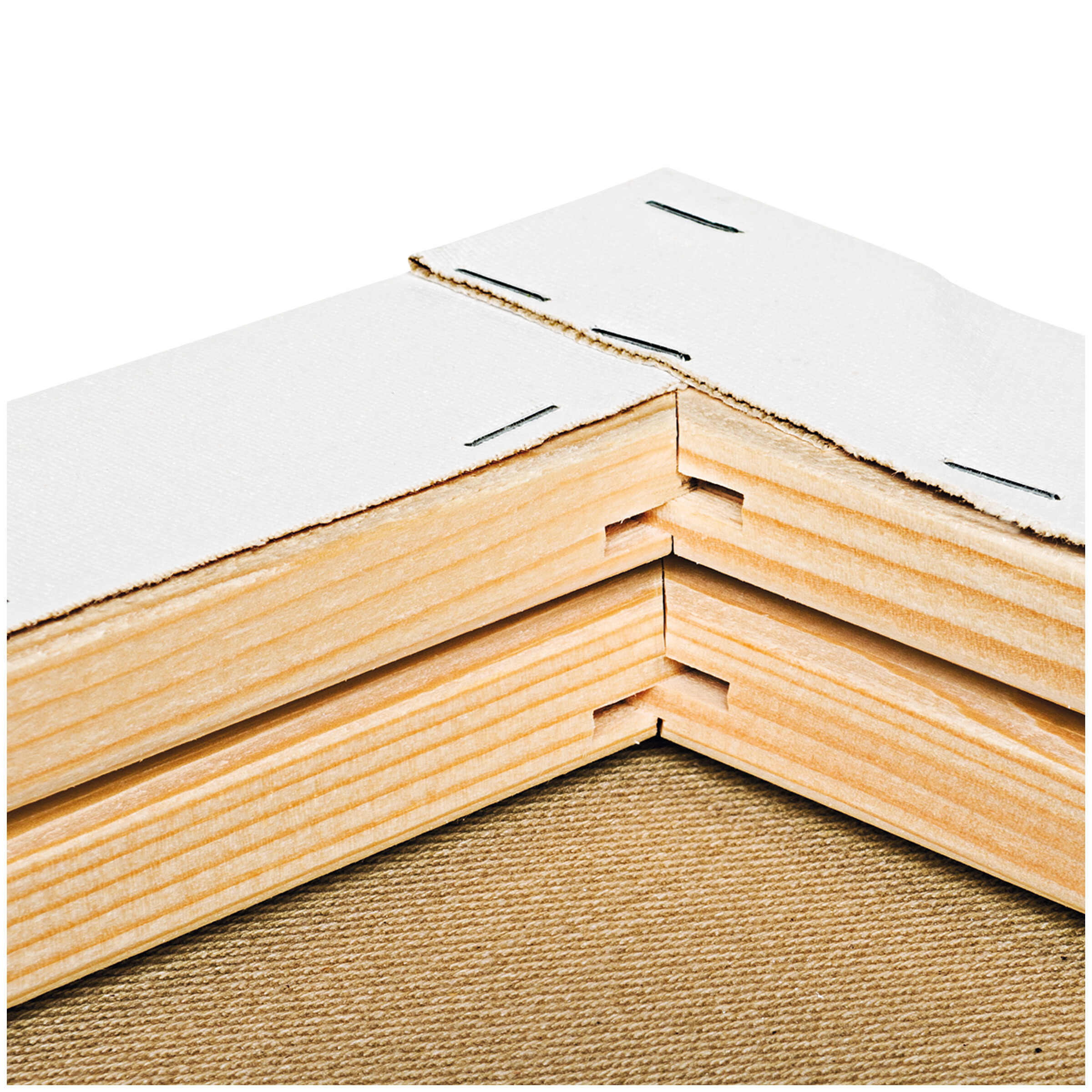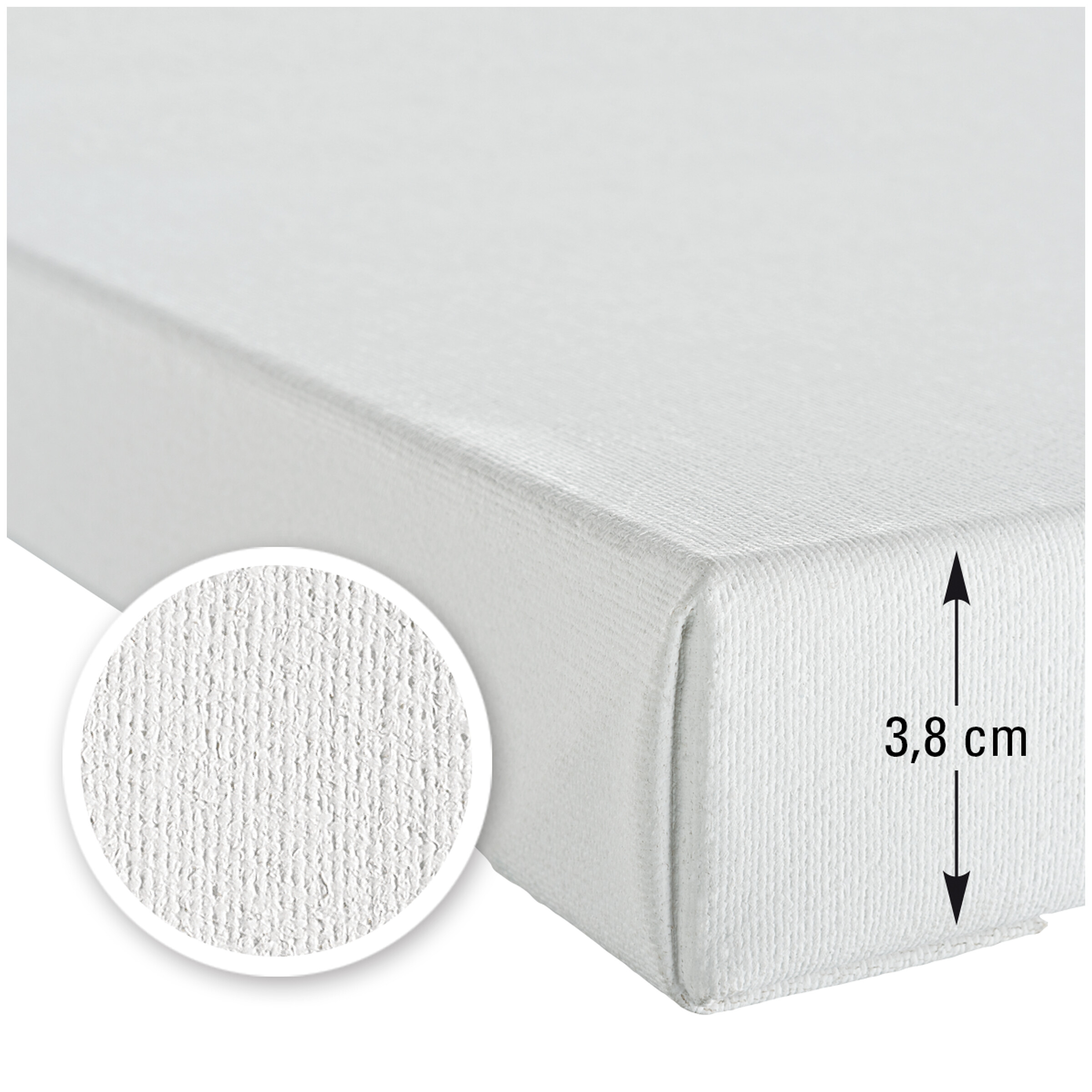 Baumwollgewebe Gospel 410 g/m², eine schwere, sehr stabile und reißfeste Gewebequalität mit weißer, leicht saugender Universalgrundierung. Für den Duo werden keilgezinkte Keilrahmenleisten gedoppelt, sodass bei dem bespannten Keilrahmen eine Gesamttiefe von ca. 3,8 cm entsteht. Die Klammerung befindet sich auf der Keilrahmen-Rückseite.