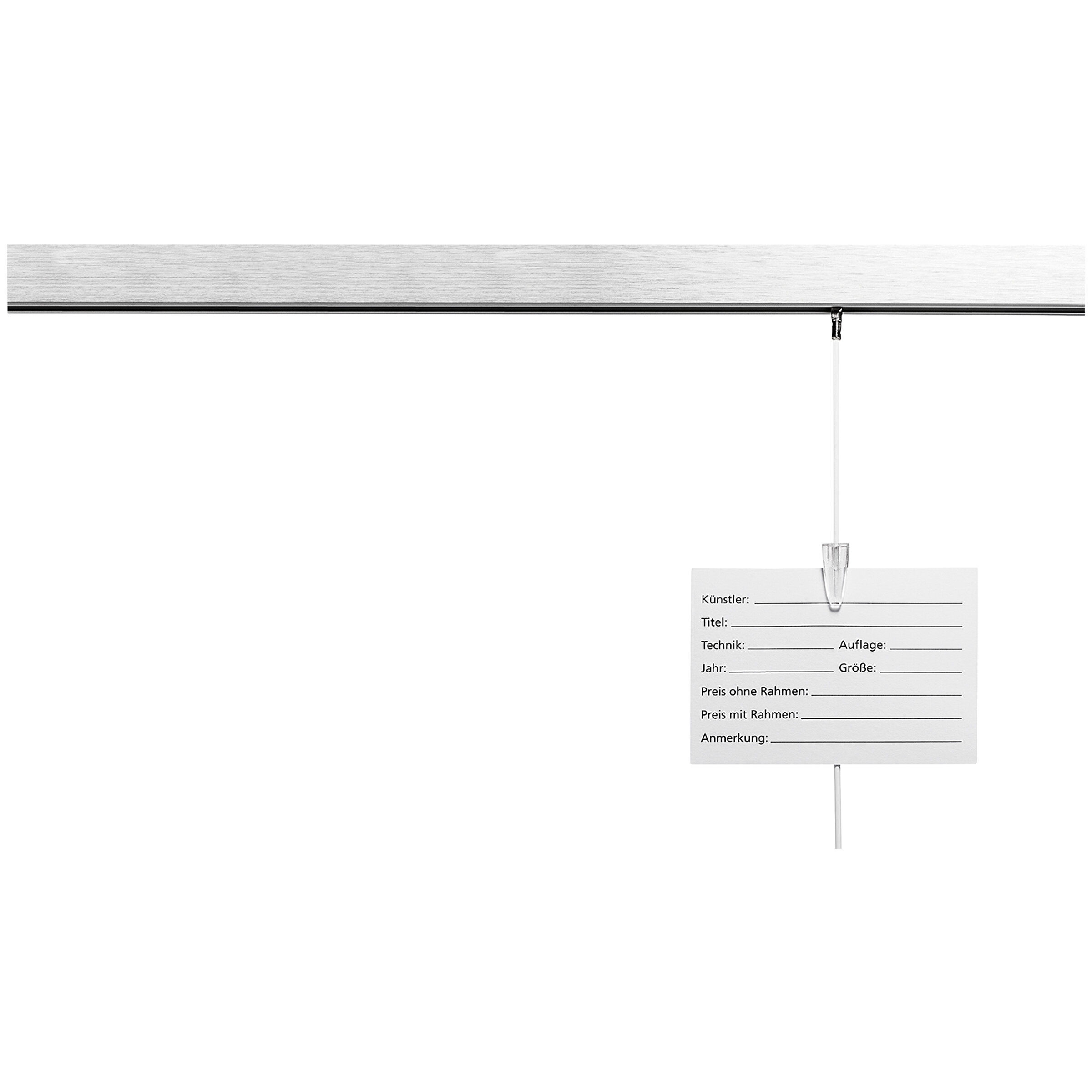 Der transparente Kunststoffclip zur Befestigung an Perlon- oder Stahldrahtseilen (Ø 1,5 – 2 mm) oder einer Stabaufhängung hält z. B. Titelkärtchen aber auch Papierarbeiten, Postkarten oder Fotos. Er wird seitlich angeklipst und durch...