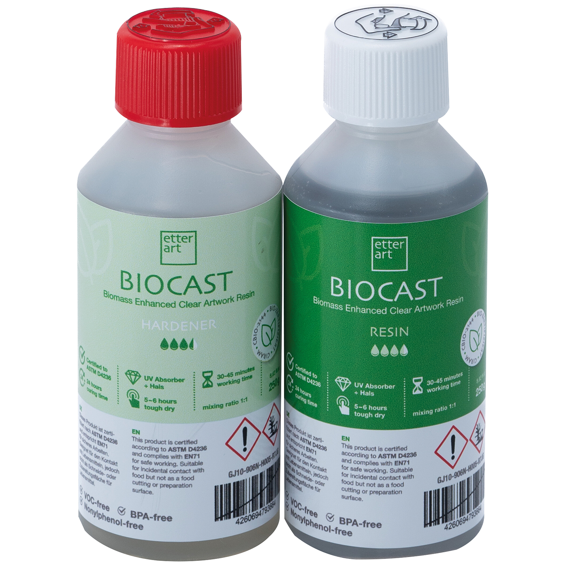 Bio-zertifiziertes, klares 2-Komponenten-Epoxidharz mit Biomasse-Anteil (33 % im Harz, 8 % im Härter) für künstlerisches Gestalten. Die hohe Viskosität ertaubt exaktes Arbeiten, auch an Bildrändern. Biocast kann klar oder eingefärbt...