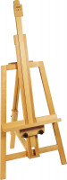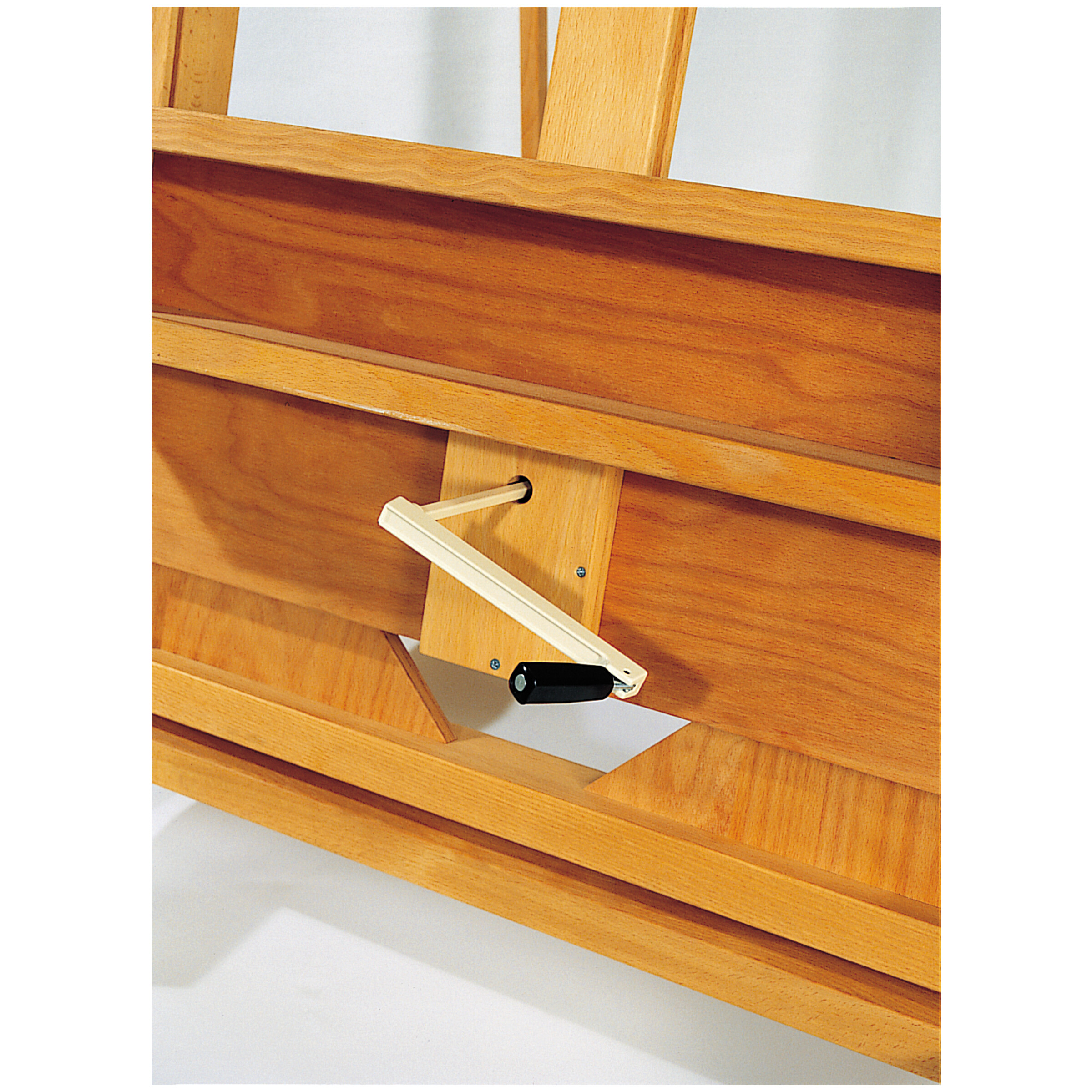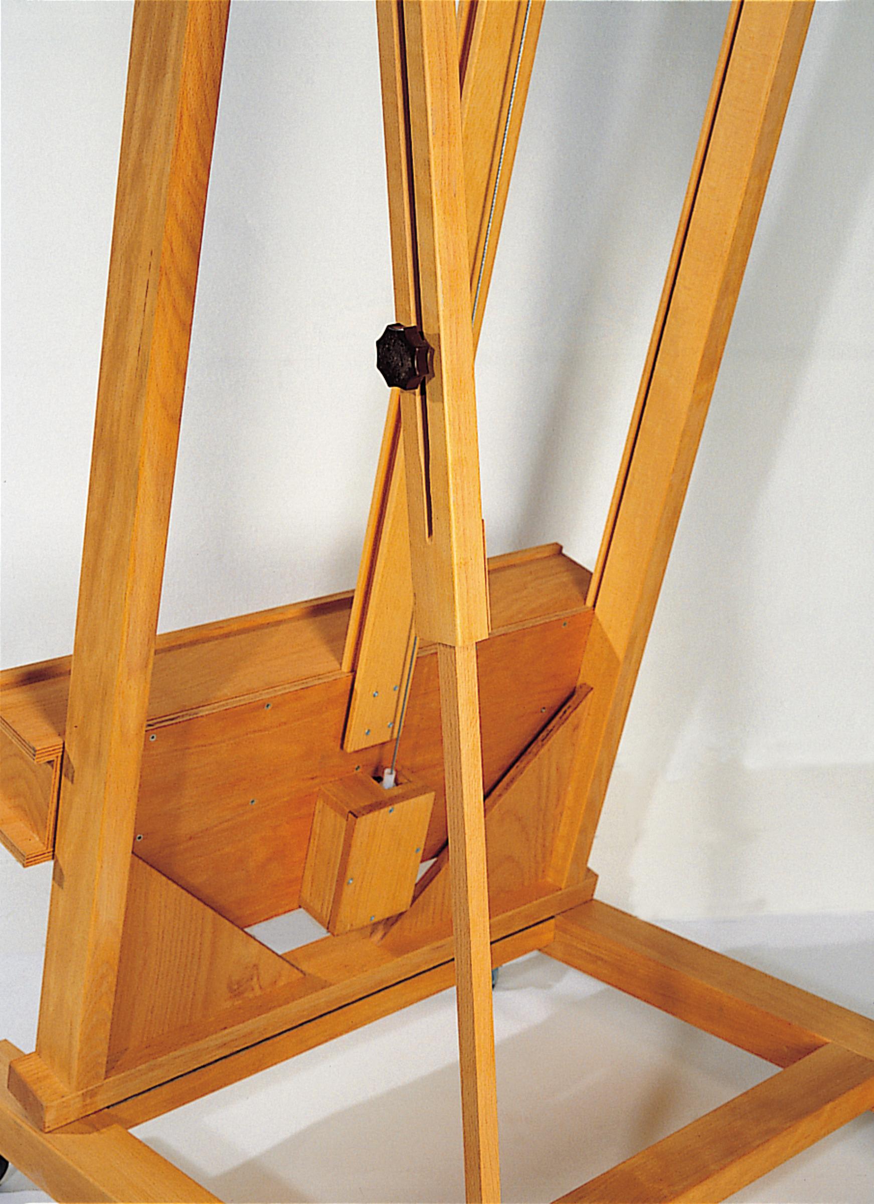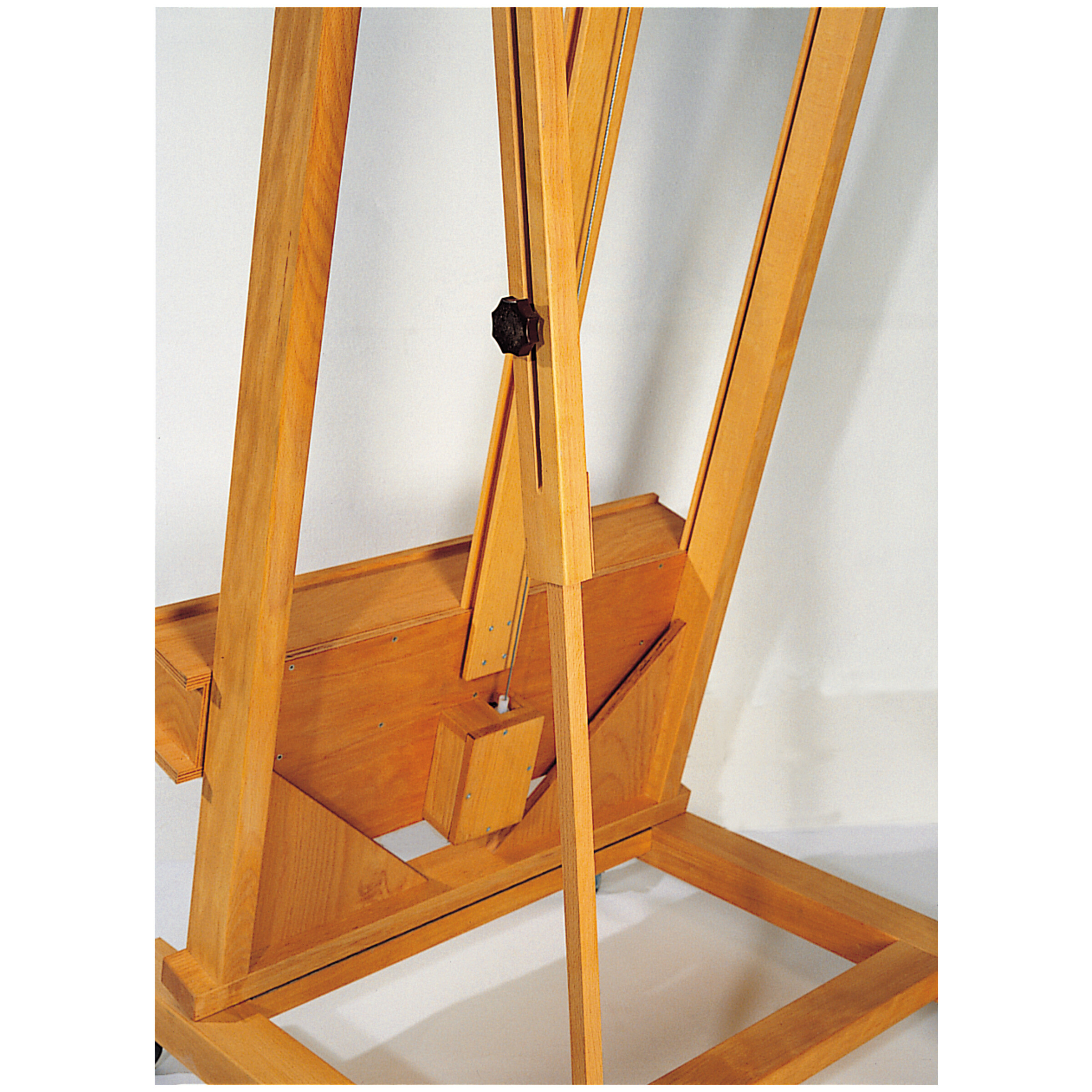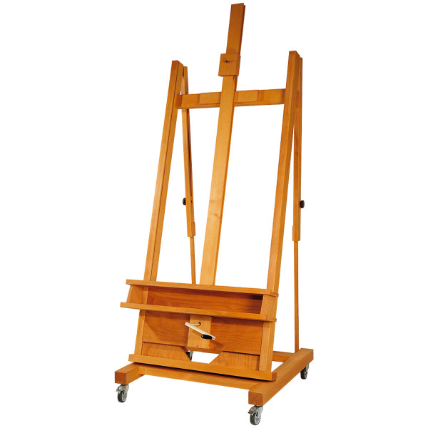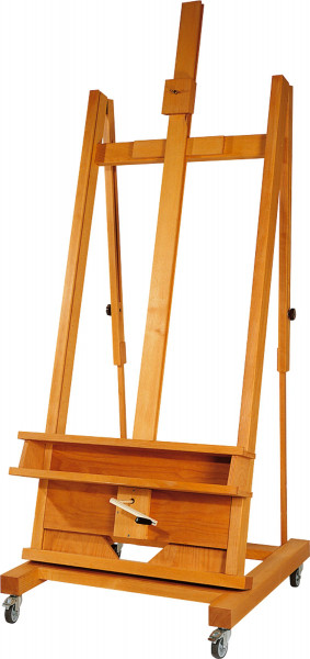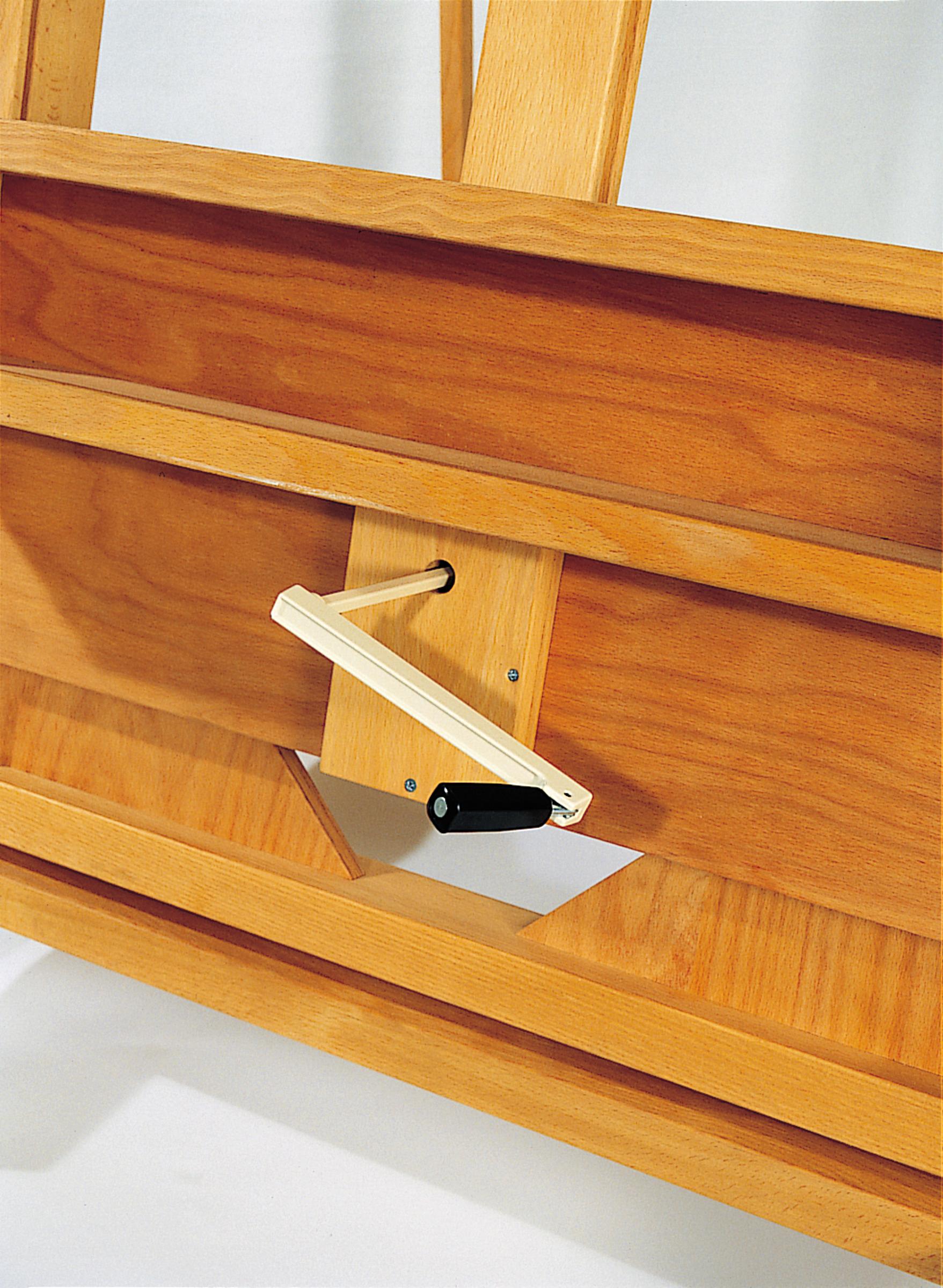 Absolute Profi-Staffelei bester handwerklicher Arbeit, aus Buche natur, mit Leinöl eingelassen. Höhenverstellung (ca. 85 cm) mittels einer Handkurbel und eines Leichtlaufgetriebes mit einer Tragkraft von 80 kg. Tisch mit großem Ablagefach. Schrägstellung stufenlos durch Schiebestützen. Schwenkbare Laufrollen mit Feststellern, die ein Wegrollen beim Arbeiten verhindern. Durch die enthaltene Verlängerung zum Aufstecken und Anschrauben lassen sich Bildformate bis max. 203 cm bearbeiten.