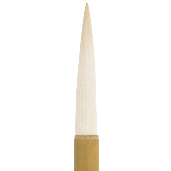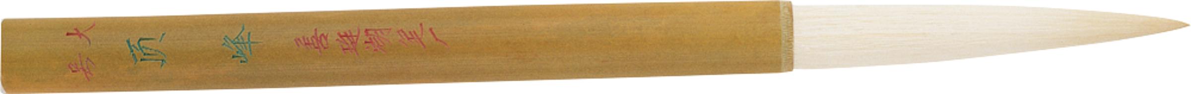 Kräftiger Ziegenhaarpinsel mit weißem, langem Haar. Haarlänge ca. 9,7 cm, Stiellänge 21,5 cm, Durchmesser 1,9 cm. Der dicke Bambusstiel ist mit roten und grünen Schriftzeichen verziert.