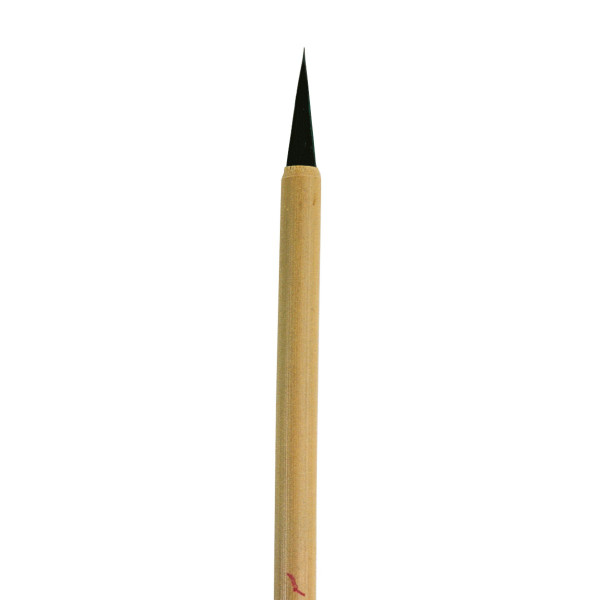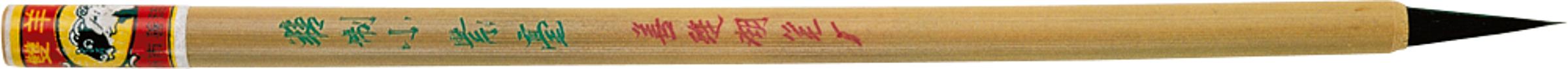 Mit Purpurwieselhaar, Haarlänge ca. 2 cm, Stiellänge 15,5 cm. Der Bambusstiel ist mit roten und grünen Schriftzeichen verziert.