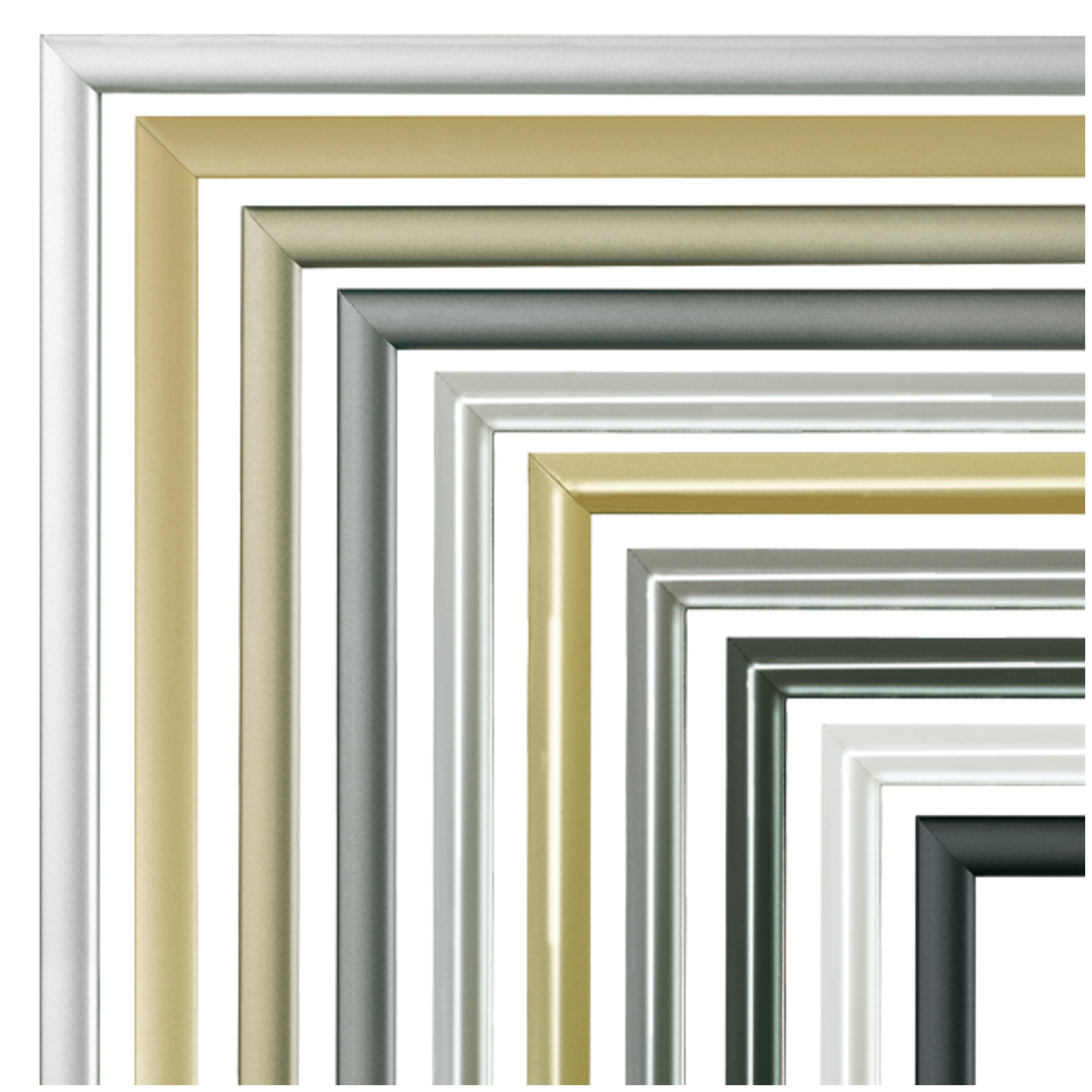 Aus hochwertigem Aluminium komplett mit 2 mm kantengeschliffenem Floatglas (DIN AO mit 3 mm-Glas), 170 g/m²-Einlegepapier in Museumsqualität und stabiler Rückwand. Die Rückwand ist mit Drehfedern und zwei separaten Aufhängern versehen. Das ermöglicht den schnellen Bildwechsel und die einfache Aufhängung im Hoch- oder Querformat.