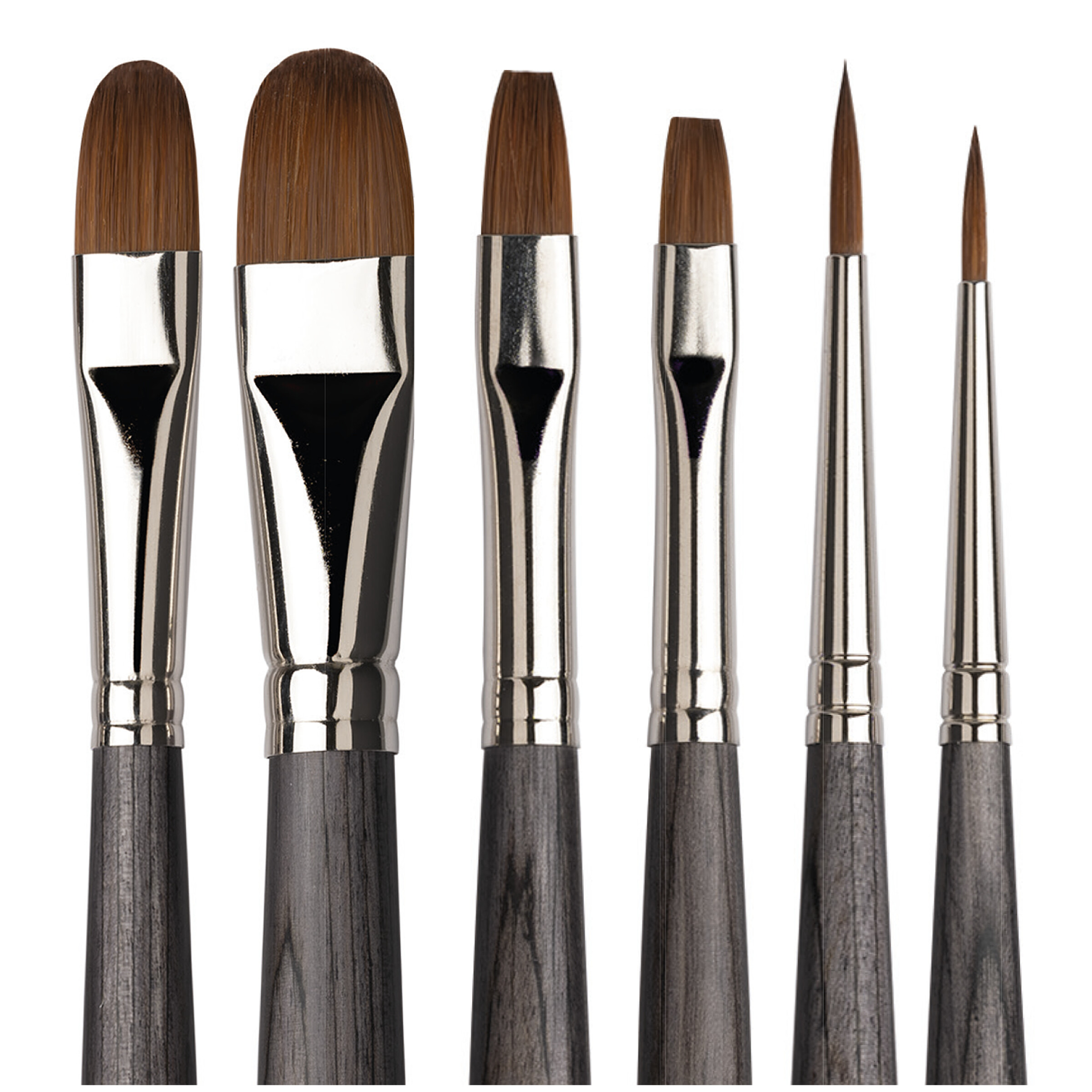 Das Sortiment umfasst Pinsel in runder und flacher Form sowie in Katzenzungenfasson.