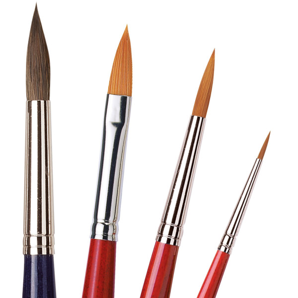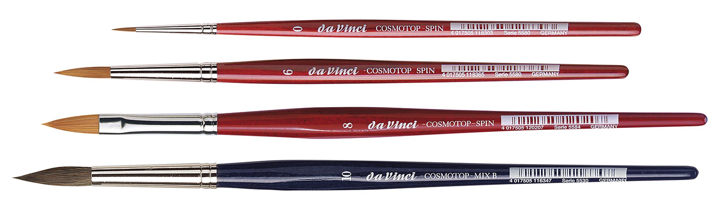 Das Aquarellpinsel-Set besteht aus vier Pinseln mit ergonomischen Esagonalstielen und besonders farbaufnahmefähigem Besatz. Enthalten sind ein Rundpinsel der Cosmotop-Mix B Serie 5530 in Größe 10, je ein Rundpinsel der Cosmotop-Spin Serie 5580 in Größe 0 und 6 sowie ein Ovalpinsel der Cosmotop-Spin Serie 5584 in Größe 8. Der Besatz der Cosmotop-Mix B Serie 5530 besteht aus einer Komposition klassischer Naturhaare (Marder, Feh, Iltis) mit hoch elastischen Kunstfasern, die Pinsel der Cosmotop-Spin-Serien sind mit extrafeinen, sehr geschmeidigen Synthetikfasern besetzt. Made in Germany.