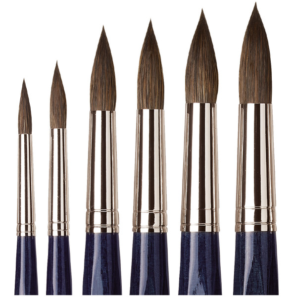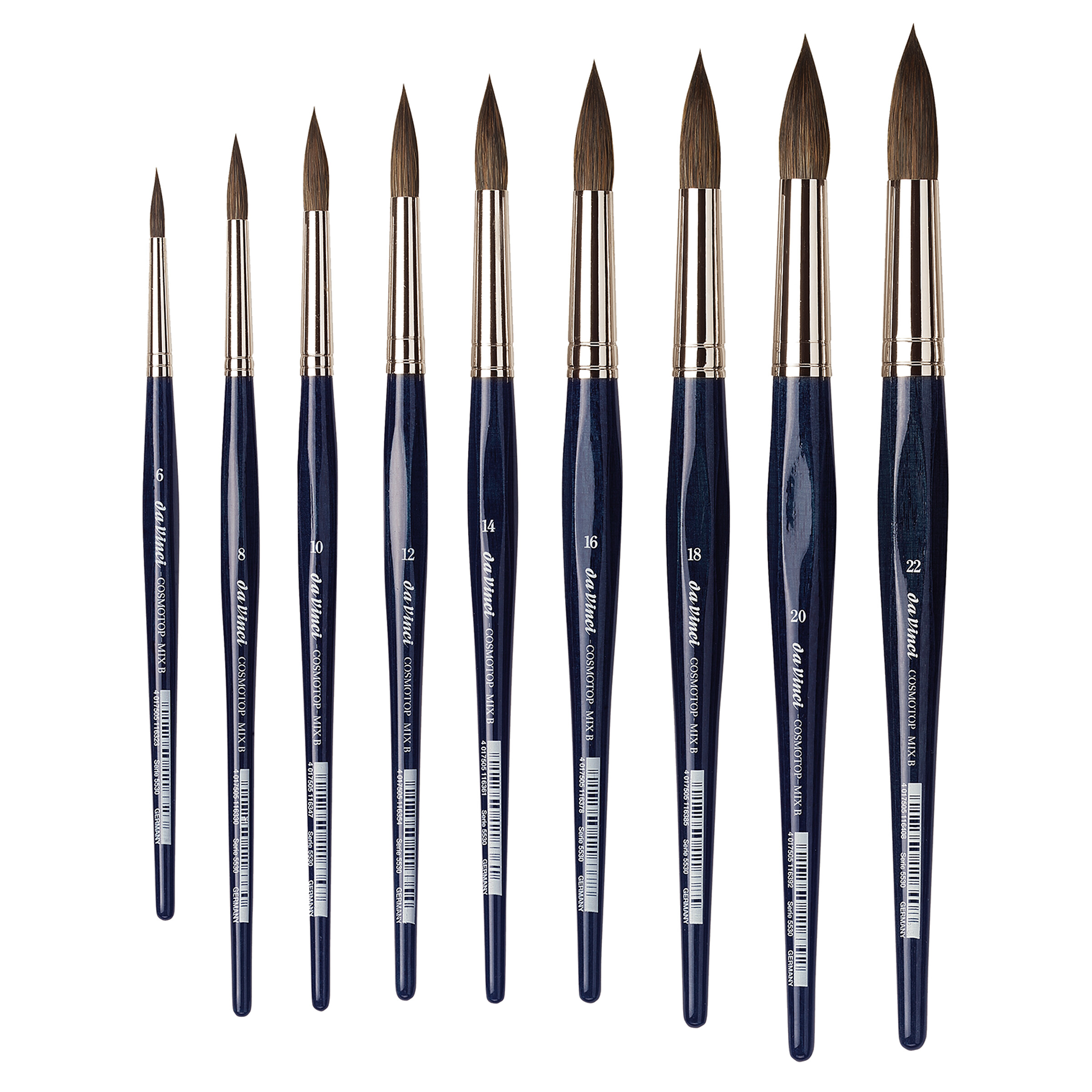 Die runden Aquarellpinsel der Cosmotop Mix B-Serie bestehen aus einer Komposition klassischer Naturhaare von Marder-, Feh und Iltis in Verbindung mit hoch elastischen Kunstfasern. Dadurch vereinen sie die saugenden Eigenschaften der Naturhaare mit der stabilen Form eines Synthetikpinsels. Made in Germany