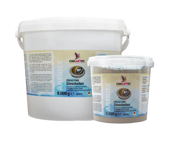 Vielseitig verwendbare Betongießmasse für die Herstellung dekorativer Objekte. Beim Guss entstehen leicht glänzende, glatte Formteile. Ist eine poröse Oberfläche in klassischer Beton­optik gewünscht, wird die Gießform zunächst mit Beton ausgestrichen (bei Verwendung von Stein-Trennmittel wird die Gießform leichter entformbar) und die angemischte Betonmasse nach einer kurzen Antrocknungszeit (ca. 15–20 Minuten) eingefüllt. Das Aushärten der Masse dauert etwa 2–3 Tage. Nach dem Entnehmen aus der Form sollte das gegossene Objekt noch 2–3 Tage nachtrocknen. Danach ist Bemalen, Lackieren und Verzieren mit allen Farbmitteln möglich. Der Gießbeton ist schadstoffarm und kann daher unter Aufsicht und Berücksichtigung der Sicherheitshinweise auch in der Kunstpädagogik eingesetzt werden.