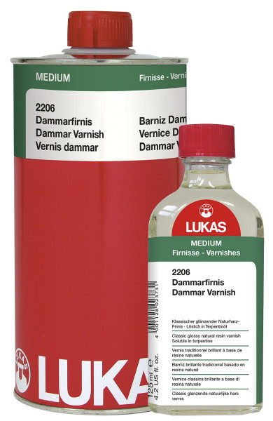 Mit mittlerem Glanz auftrocknender Naturharz-Firnis für Öl- und Temperabilder. Kann mit Terpentinöl oder Citrusterpentin verdünnt werden. Eingestellt für Pinselauftrag. Für Spritzpistolen dem Druck und der Düsengröße entsprechend verdünnen. Hinweis: Dammar-Firnisse verlieren mit der Zeit etwas an Elastizität. Enthält extra-hellen Batavia-Dammar, rektifiziertes Terpentinöl.