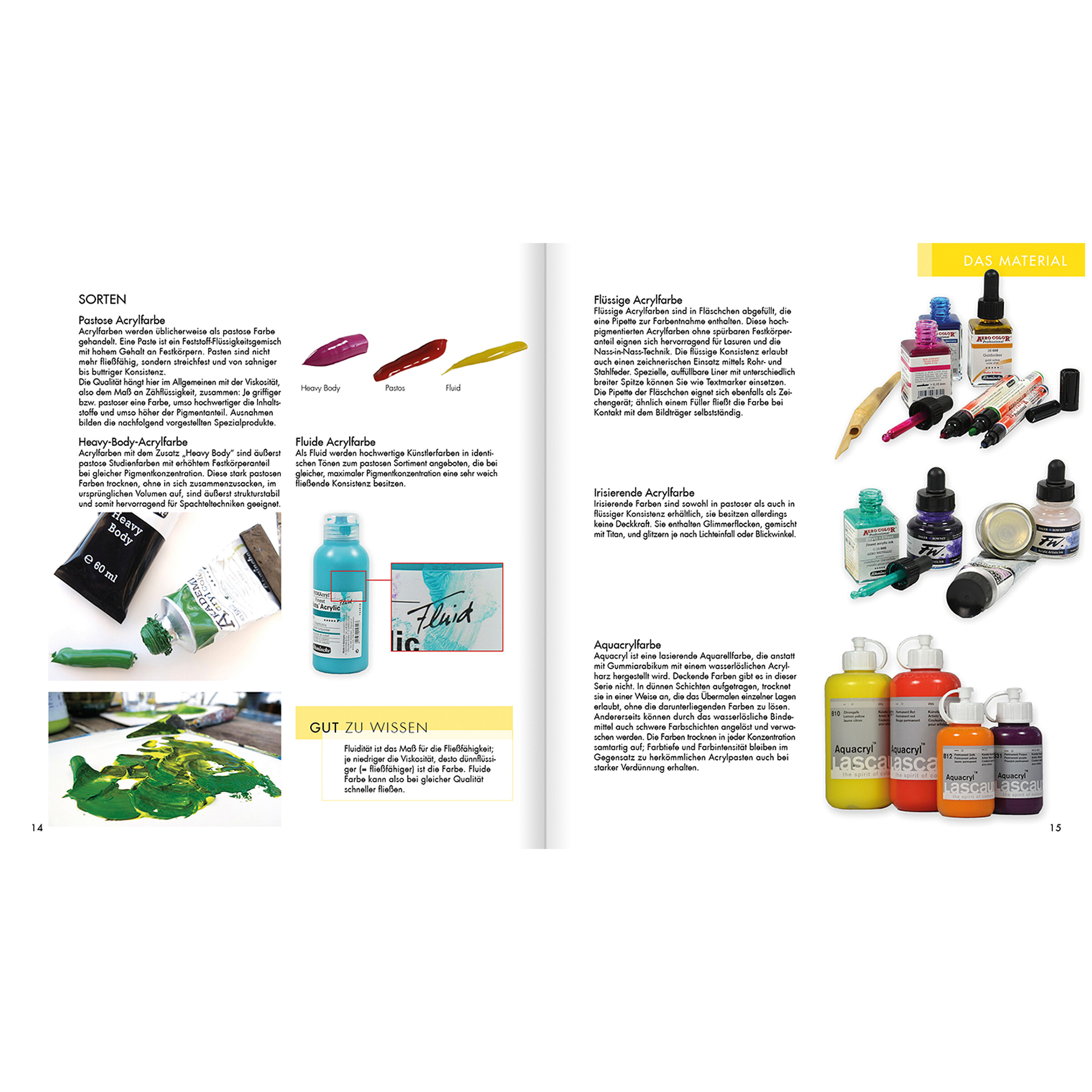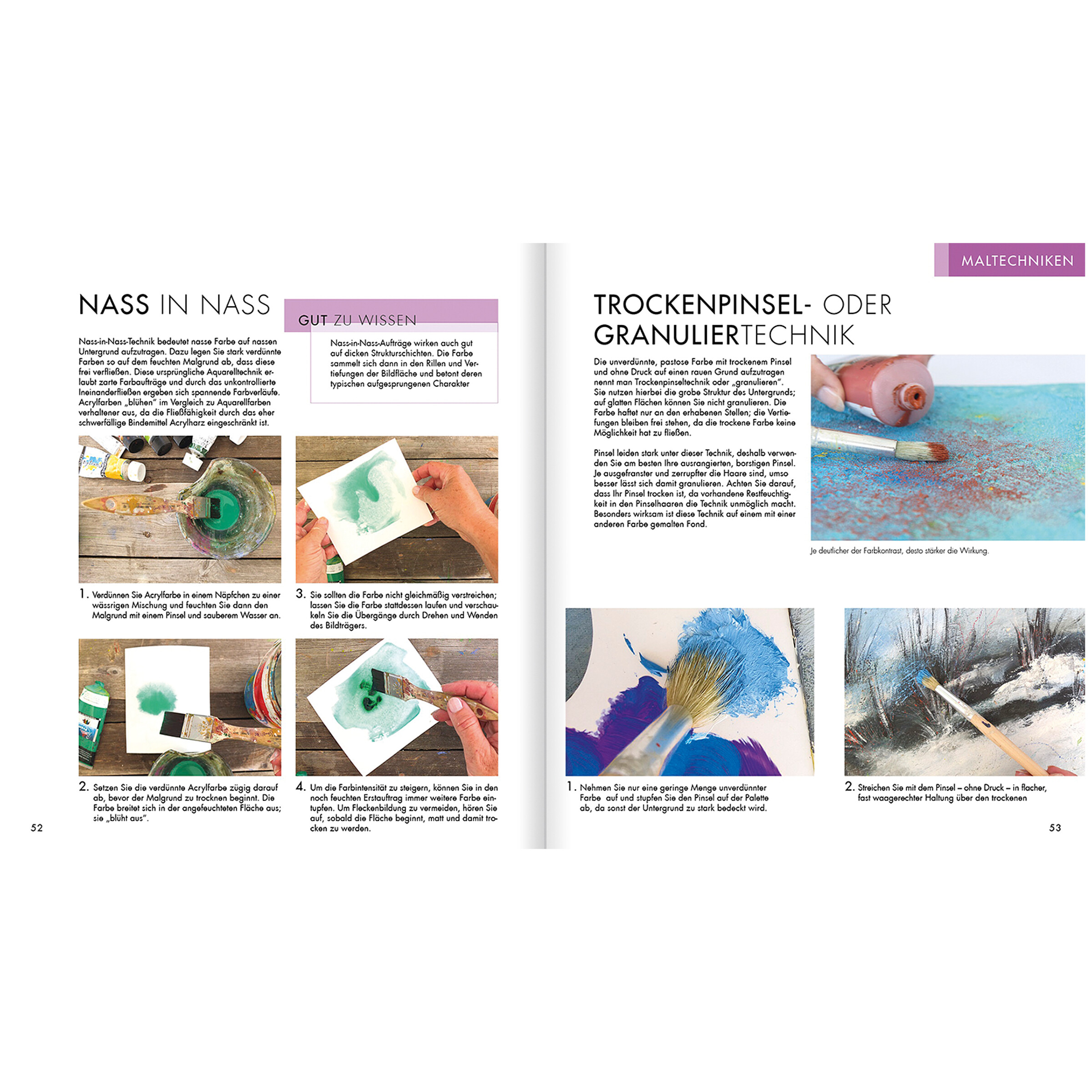 Die Autorin stellt alle wichtigen Informationen, begonnen beim Material, über Werkzeuge und Hilfsmittel bis zur Farbenlehre, anschaulich dar. Mal- und Strukturtechniken finden dabei ebenso ihren Platz wie Ausführungen zur Bildkomposition bevor in zahlreichen Projekten das Gelernte umgesetzt und erprobt werden kann.