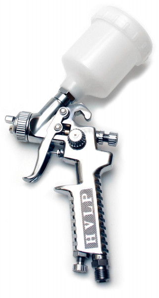 Professionelle Airbrush-Pistole mit 0,5 mm-Düse für mittlere bis großflächige Arbeiten wie z. B. Urban Art, Graffiti, Hintergründe, Beschriftung, Tattoos, Bodypainting, Designlackierung usw. Geeignet sowohl für die Verwendung lösungs­mittelhaltiger Farben und Lacke als auch für die Verarbeitung stark pigmentierter und dickflüssigerer Künstlerfarben. Sprühwinkel, Nadelregulierung sowie Luftmengenverbrauch sind einstellbar, um einen entsprechend der Konsistenz der verwendeten Farbe optimalen Auftrag zu erzielen. Der große lösungsmittelbeständige Farbbehälter fasst 125 ml und erlaubt zügiges Arbeiten. Umrüstbar auf 1 mm-Düse für großflächigere Arbeiten und dickflüssigere Farben. Luftmengenverbrauch: ca. 30 bis 45 l/min, entsprechend dem eingestellten Sprühwinkel und Ausgangsdruck.