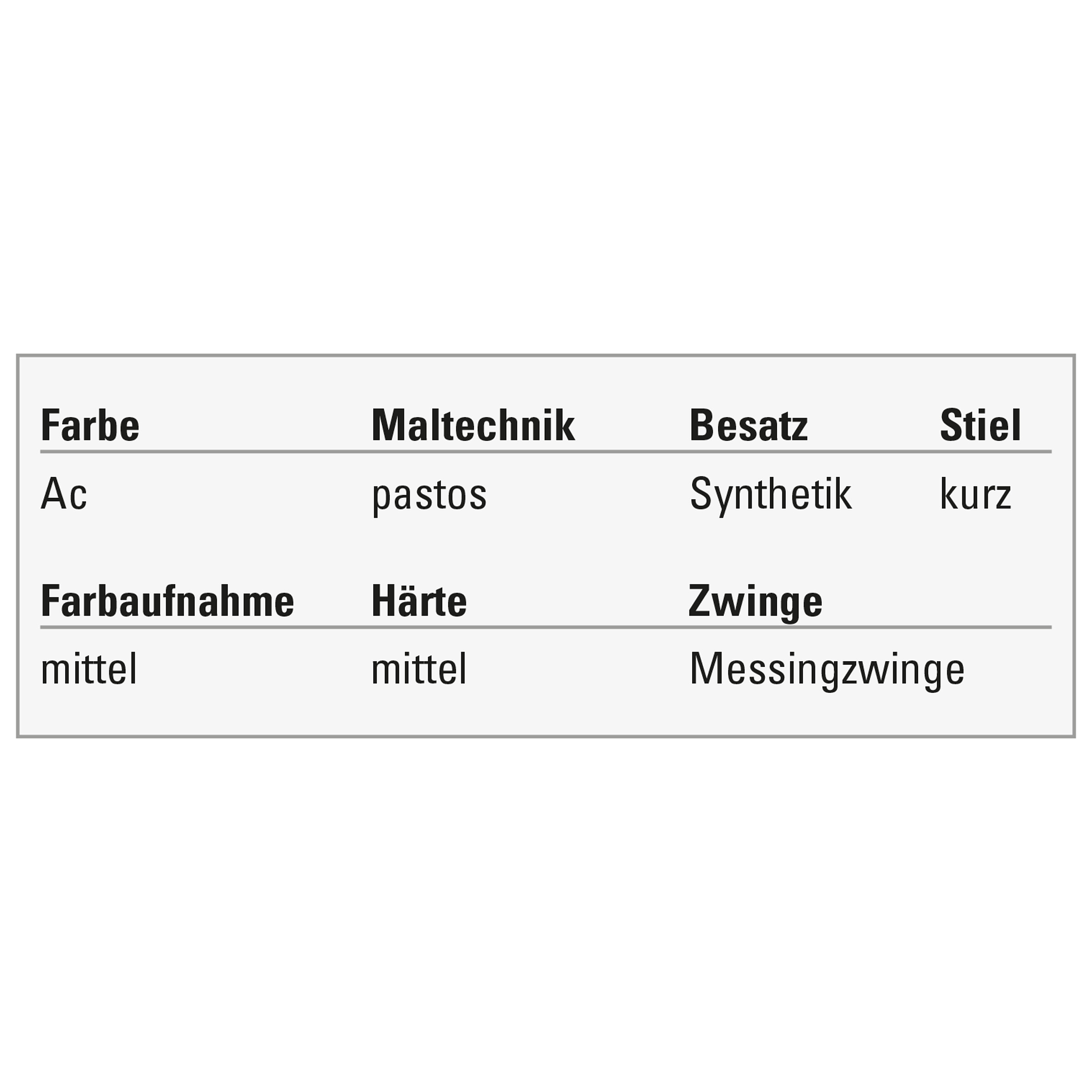 Pinsel mit kurzem, fest gebundenem Besatz aus kräftigen, hochresistenten Polyamidfasern. Perfekt für Akzente, Strukturen und Kratztechniken mit pastosen oder sehr trockenen Farben. Insbesondere im Modellbau lassen sich auf...