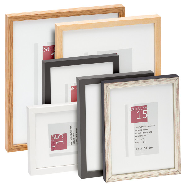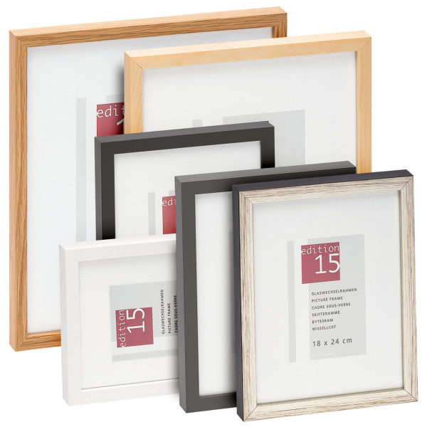 Glaswechselrahmen aus heimischen Massivhölzern. Eckiges, aktuelles Design. Beste und aufwendige Verarbeitung. Für die Rahmung von Fotos, Zeichnungen, Aquarellen und anderen Papierarbeiten. Die Edition 15 wird nach boesner-Qualitätsstandard gefertigt. Komplett mit 2 mm-Floatglas, Einlegepapier und stabiler Hartfaserrückwand mit Metall-Drehverschlüssen.