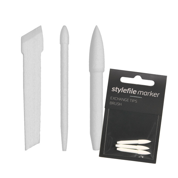 Erhältlich in drei Ausführungen: Ersatz-Keilspitzen für alle Stylefile Marker sowie als Finelinerspitze für die Standard-Marker und als Pinselspitze für die Brush-Marker.