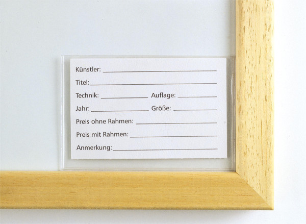 Die Etikettentaschen für Titelkärtchen haben auf der Rückseite eine praktische Klebehaftung. Titelkärtchen können leicht in die Tasche eingeschoben werden.