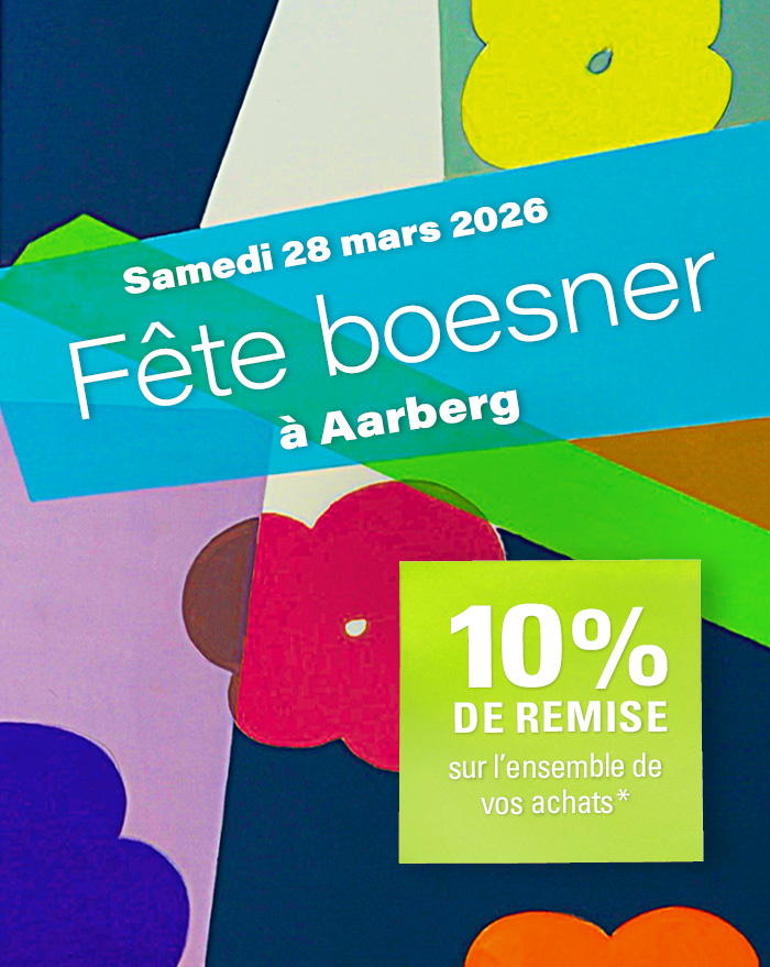 Nous vous invitons chaleureusement à la fête boesner à Aarberg. Participez à notre concours et tentez de gagner, avec un peu de chance, un bon Atelier boesner d’une valeur de CHF 600.–. Profitez toute la journée d’une remise de 10 %* sur l’ensemble de la gamme boesner, y compris les cadres sur mesure et les châssis.