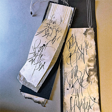 Diese kurzen Gedichte lassen sich ganz besonders schön kalligrafisch umsetzen und mit der Japanischen Fadenheftung in Szene setzen. Leichte Papiere und eine hängende Bindung lassen die Texte quasi durch den Raum wehen.