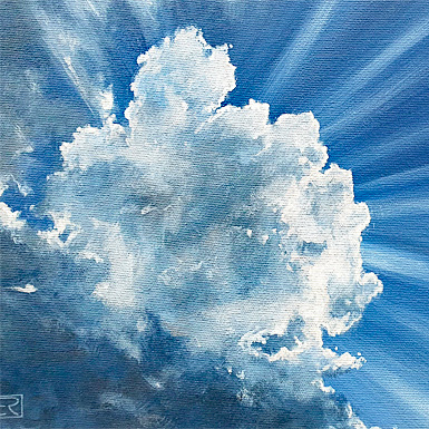 Die Dozentin zeigt Schritt für Schritt, wie man einen blauen Himmel mit Wolken malt, der von Sonnenstrahlen durchbrochen wird. Sie erläutert anhand von Beispielen ausführlich die Technik, wie Wolken mit Farben, Licht und Schatten realistisch erscheinen.