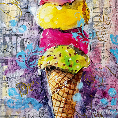 Ob Eiskugeln oder Tassen, in diesem Kurs kombinieren Sie aus alten Zeitungen zuerst eine Collage auf Aquarellpapier.