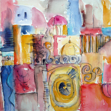 Spiel und Experiment mit Material, Farbe und Form – Aquarell oder Acryl in Kombination mit Ölfarbenzeichnung.