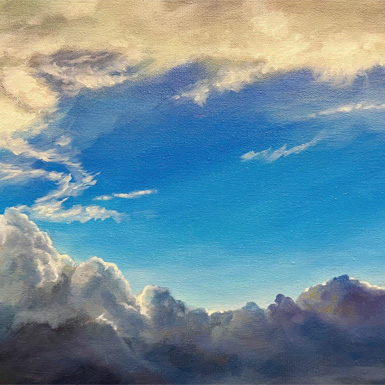 Anhand einer Vorlage malen Sie ein Wolkenmotiv in wasservermalbarer Ölfarbe.