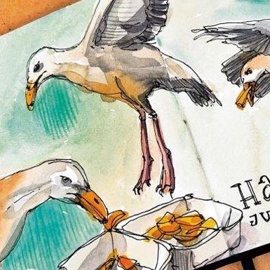 Die Planung und das Layout einer Doppelseite im eigenen Sketchbook, das Fixieren Ihrer persönlichen Erlebnisse in kleinen Skizzen mit Füllfederhalter und wasserfester Tinte werden zeichnerisch erarbeitet und mit kompakter Reisepalette von 12 Aquarellfarben koloriert.