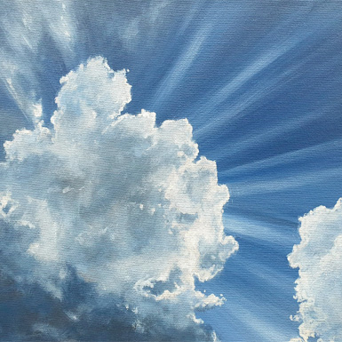 Sonnenstrahlen die Wolkenhimmel durchdringen, sind das Thema dieses Workshops. Die Dozentin zeigt Schritt für Schritt, wie man einen blauen Himmel mit Wolken malt, der von Sonnenstrahlen durchbrochen wird. Sie erläutert anhand von Beispielen ausführlich die Technik, wie Wolken mit Farben, Licht und Schatten realistisch erscheinen.