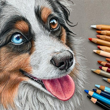 In diesem Grundkurs erfahren Sie Schritt für Schritt, wie Sie eine stimmige Untermalung anlegen, Hundeaugen mit Tiefe und Glanz zeichnen und weiches Hundefell realistisch gestalten.