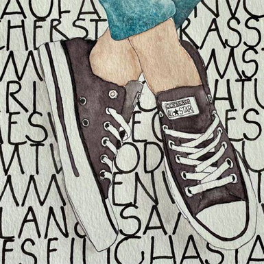 Als Basis dient eine kalligrafische Schrift, die mit einer Aquarellillustration ergänzt wird.