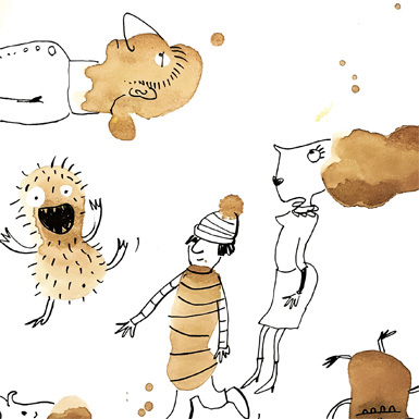 Mit Tusche, Acrylfarben und Kaffee machen Sie Kleckse und Flecken. Entdecken das Unsichtbare: was oder wen können Sie in den Klecksen und Flecken erkennen? Hier gibt es kein „richtig“ oder „falsch“ – Sie müssen kein Profi sein, um Spaß zu haben! Aus Collageelementen und Kritzeleien entstehen lustige Figuren.