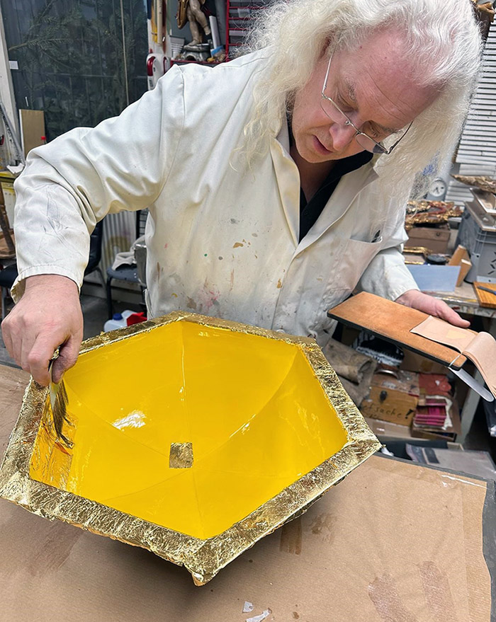 In diesem Kurs lernen Sie die moderne Blattmetallisierung mit Echtgold und Schlagmetall kennen. Wir vergolden mehrere Stuckteile mit verschiedenen Klebemitteln, von matt bis spiegelglänzend, und deren Kombinationen. Etwa 0,5 m² Fläche wird mit Aluminium, imitiertem Blattgold und Kupfer metallisiert. Besonders auf moderne Wege der Ölvergoldung wird eingegangen, intensiv geübt und praktisch angewendet. Der renommierte Vergoldermeister zeigt Ihnen seine Tricks und neue Wege im Umgang von Öl-Mixtion.