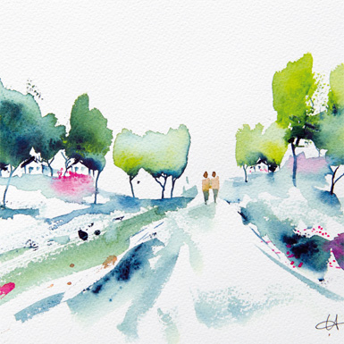 Diese Übungen werden anschließend zu kleinen Landschaften zusammengefügt. Im Fokus steht lockeres Malen, die Farben fließen zu lassen und Freude daran zu haben.