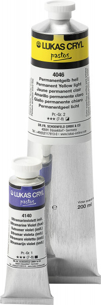 Die Künstler-Acrylfarbe hat einen besonders hohen Festkörpergehalt von annähernd 70 % und eignet sich für feinste Lasuren, Spachteltechnik oder extrem pastose Arbeiten. Sie ist lichtecht, wasserverdünnbar und trocknet in kurzer Zeit zu einem elastischen, nicht vergilbenden Film auf. Bei Lukas Cryl Pastos werden kostbare, ausgewählte Pigmente ausschließlich rein und unverschnitten eingesetzt. Sortiment: 70 Farbtöne in 37 ml- und 200 ml-Tuben.