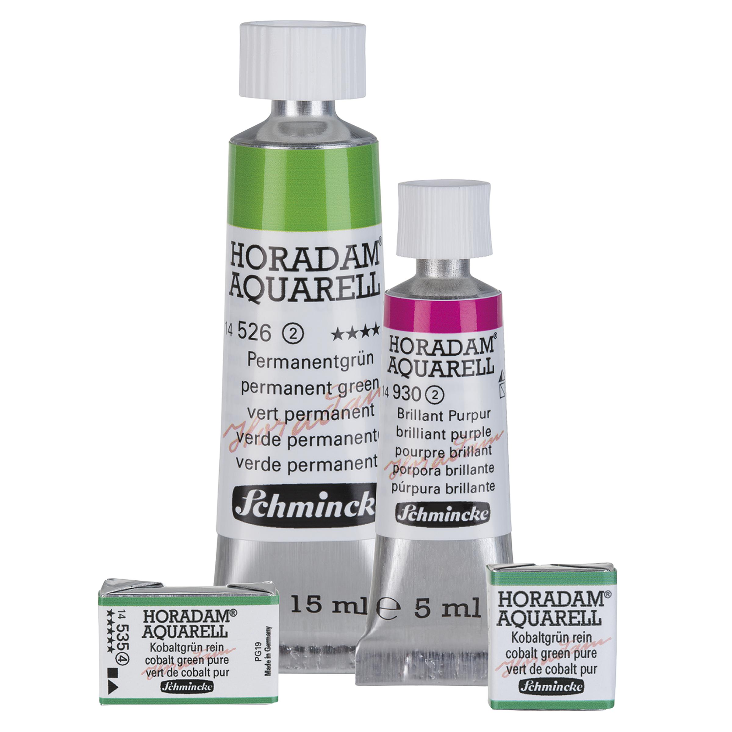 Alle 139 Farbtöne der Horadam Aquarellfarbe von Schmincke in Premium-Qualität enthalten ausschließlich die besten Rohstoffe sowie feinste, sehr wertvolle Pigmente mit vorzüglichen maltechnischen Eigenschaften. Die Farbe wird in vier eigenständigen Füllvorgängen in Näpfchen gegossen (nicht gepresst, gestanzt oder tablettiert) – ein aufwendiges Verfahren, das für höchste Ergiebigkeit und sehr gute Anlösbarkeit sorgt. Sortiment: 139 Farbtöne in 1/2 und 1/1 Näpfchen, sowie in 5 ml- und 15 ml-Tuben.