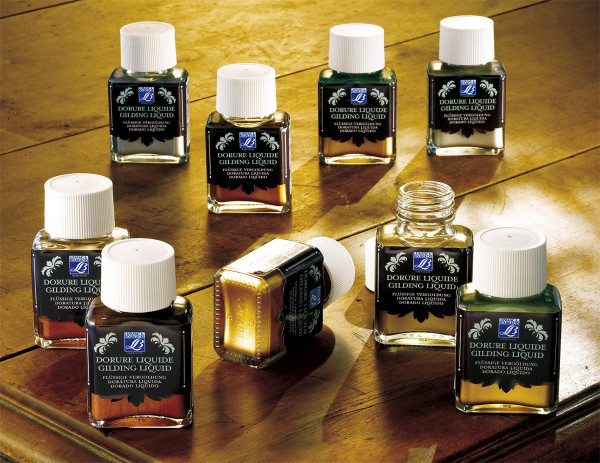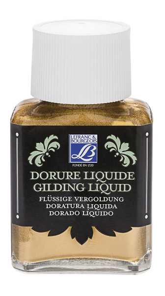 Hochwertiges Produkt zur Erzeugung metallischer Anstriche und zur gleichmäßigen Vergoldung großer Flächen. Auf Lösungsmittelbasis mit metallischen Pigmenten. Die Pigmente bieten intensive, schillernde Metallfarben, haben eine hohe Deckkraft und trocknen wasserfest und wetterbeständig auf. Lefranc & Bourgeois Flüssige Vergoldung ist gebrauchsfertig und einfach anzuwenden. Flüssige Vergoldung ist für den Innen- und Außenbereich geeignet und kann auf unzähligen Untergründen wie Papier, Holz, Ton, Glas, Gips und Metall aufgetragen werden. Erhältlich sind 9 Farbtöne in 75 ml-Flaschen.