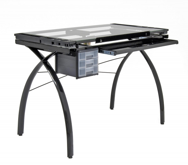Der Zeichentisch überzeugt durch anspruchsvolles und funktionales Design. Die stabile Stahlkonstruktion mit geschwungenen Füßen trägt eine solide Platte aus gehärtetem Sicherheitsglas. Mit einer Vielzahl an Fächern, Schubladen und...