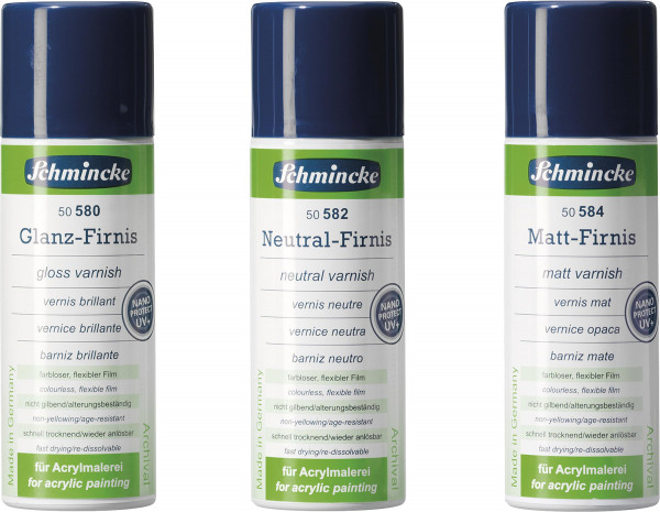 Schlussfirnisse mit UV-Schutz, speziell optimiert für die Acrylmalerei, ebenso für Inkjet Ausdrucke, Kunstdrucke oder Fotos geeignet. Farblos, elastisch, nicht gilbend, alterungsbeständig und schnell trocknend. Enthält Propan/Butan, Acrylharz, UV-Absorber und Testbenzin. Der Neutralfirnis enthält zusätzlich Mattierungsmittel.