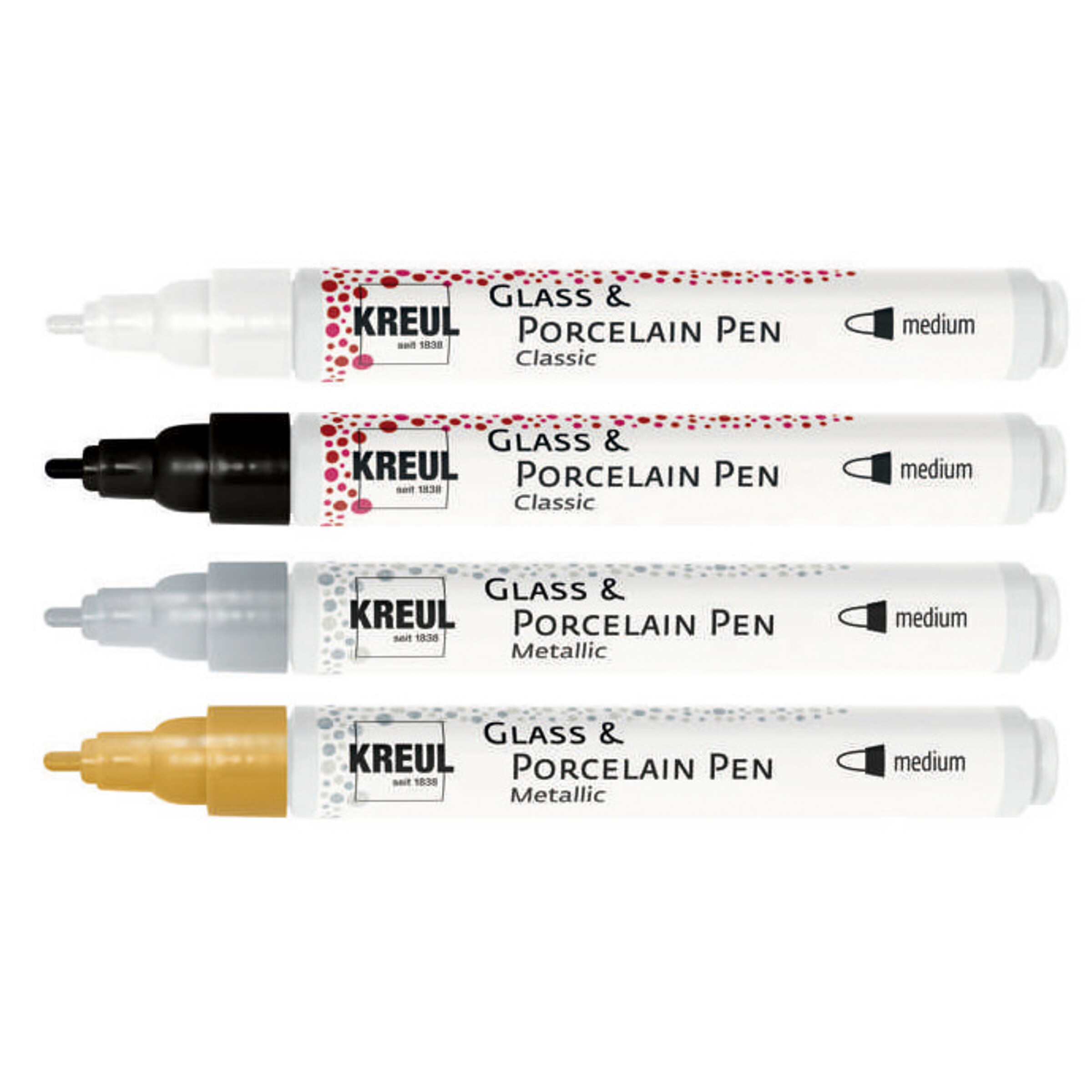 Glas- und Porzellanmalstift auf Wasserbasis mit formstabiler Spitze zur dekorativen Gestaltung von hitzebeständigen Materialien wie Porzellan, Glas, Metall oder Keramik. Nach dem Einbrennen ist die Bemalung spülmaschinengeeignet.