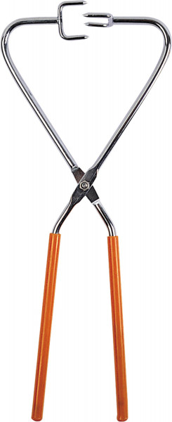 Zange mit Dreipunktauflage. Zum Halten und Eintauchen von geschrühten Objekten in die Glasur. Rundstahl, glanzverchromt mit Gummigriff. Länge ca. 31 cm, max. Breite 24 cm.